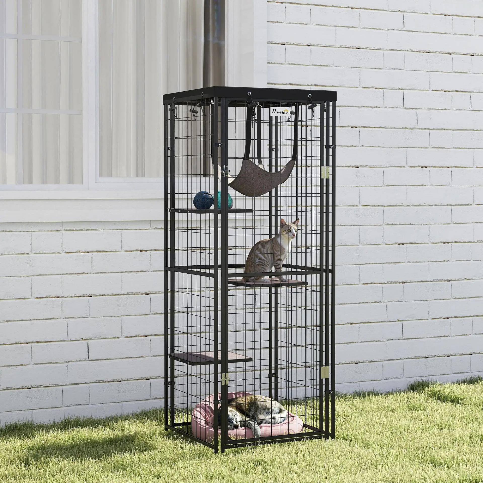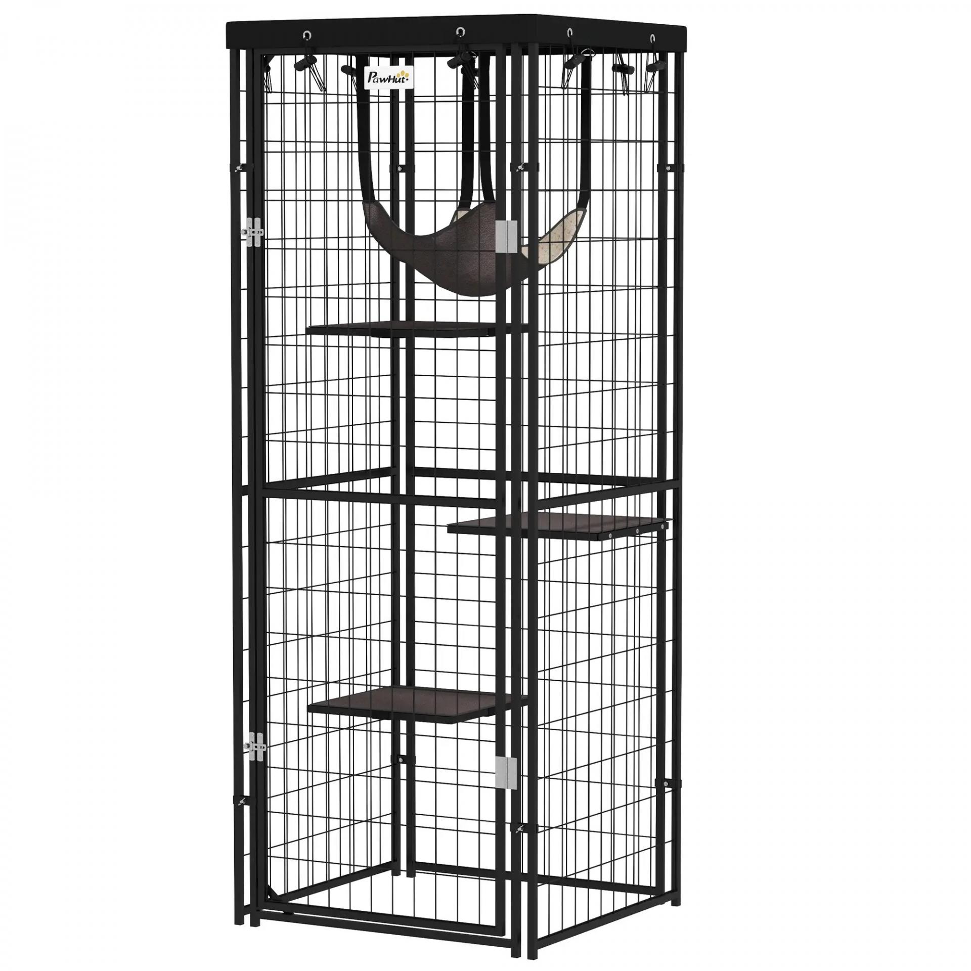 Jaula para Gatos Exterior e Interior Metálica con Cubierta Impermeable Perchas Hamaca y Puerta 61,5x55x157 cm Negro
