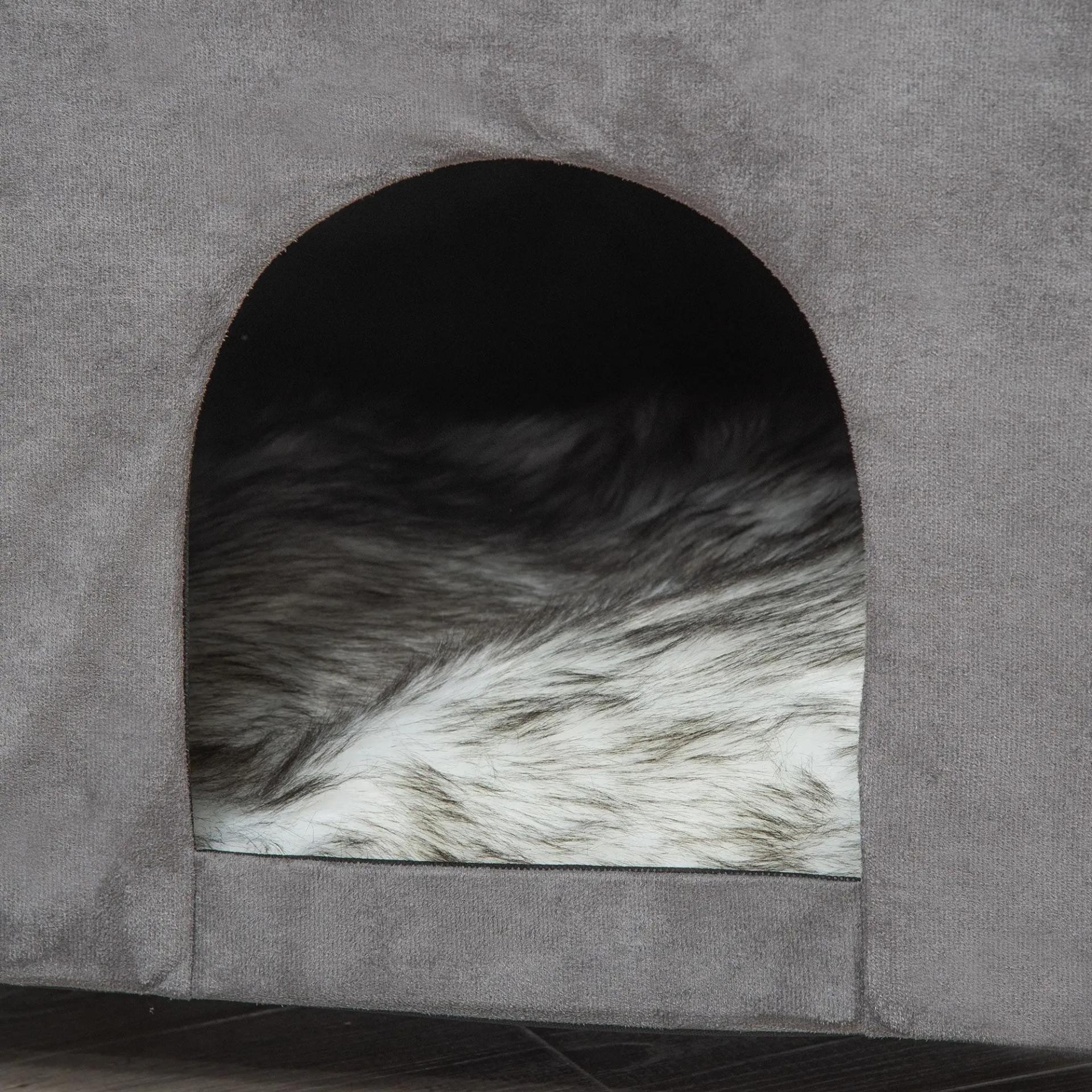 Cueva para Gatos 2 en 1 Taburete Reposapiés con Tapa Extraíble Orificio de Entrada Cojín Lavable y Patas Elevadas de Madera para Interior 60x45x44,5 cm Gris