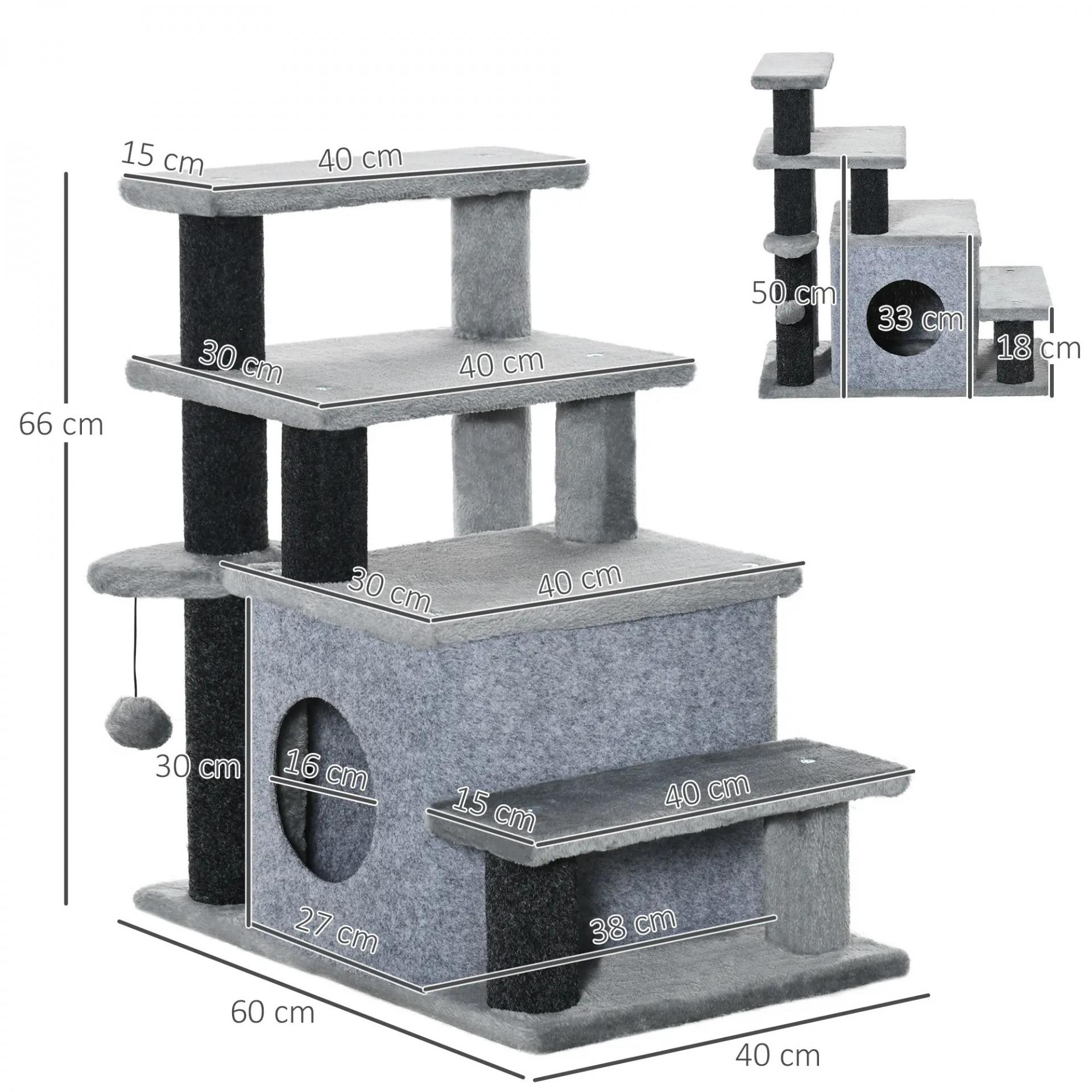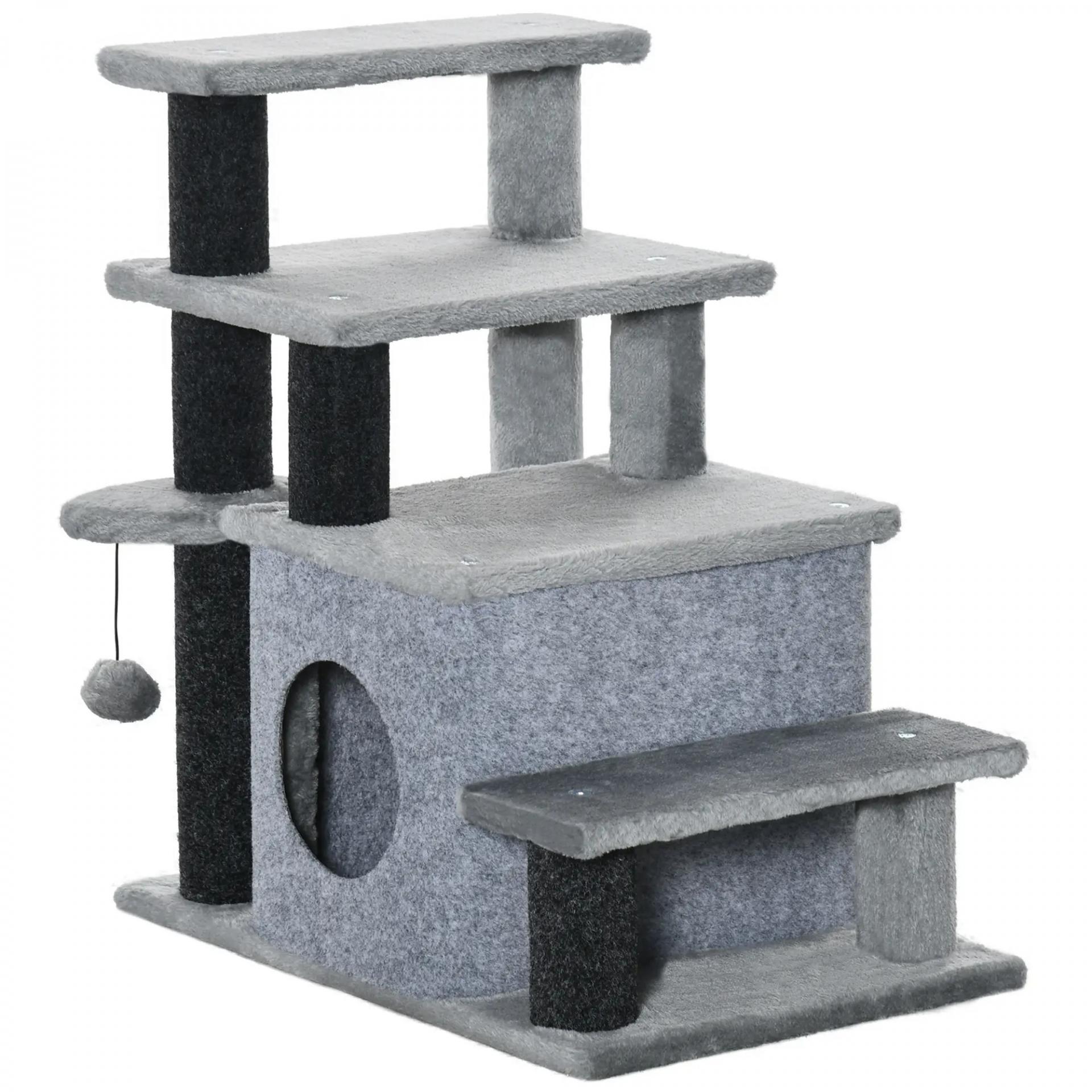Escalera para Gatos de 4 Peldaños Escalón para Mascotas Ajustable con Cueva y Bola Colgante 60x40x66 cm Gris