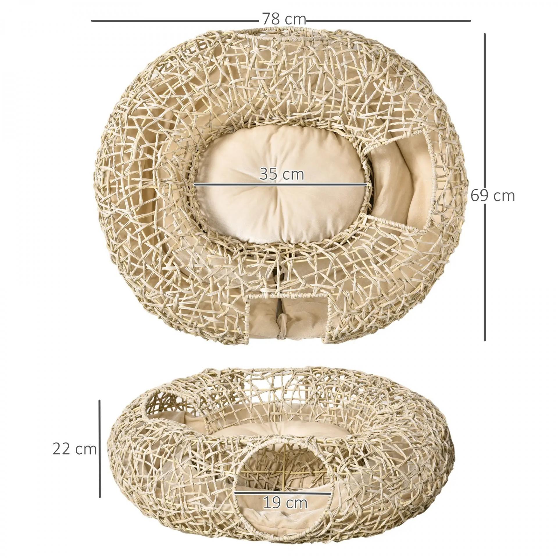 Cama para Gatos de Ratán 78x69x22 cm Cesta para Gatos Rolliza con Cojín Suave 3 Orificios de Acceso Túnel para Gatos Madera Natural