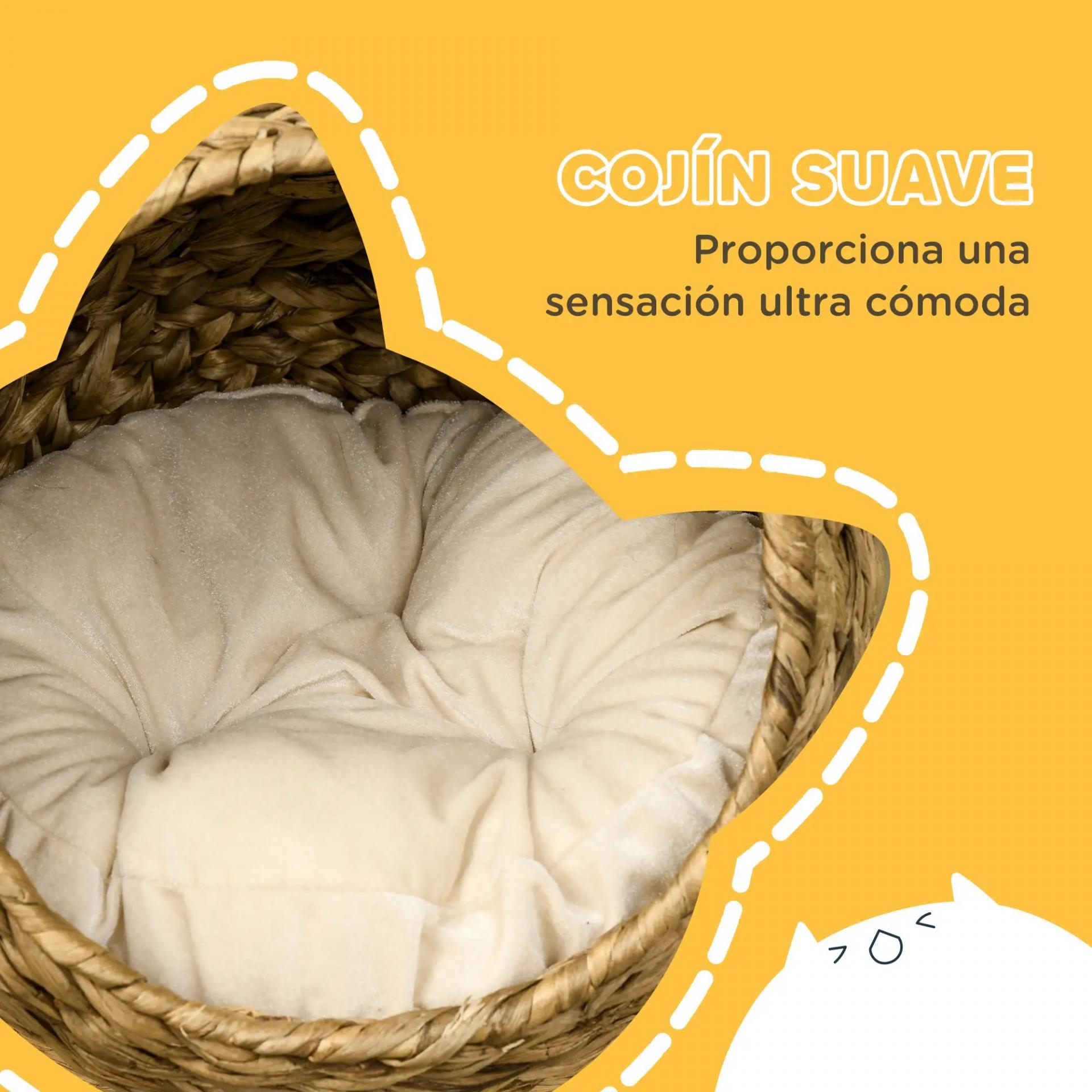 Cama para Gatos de Mimbre Cueva para Gatos Desmontable con Cojín Extraíble 40x37x51 cm Marrón y Beige