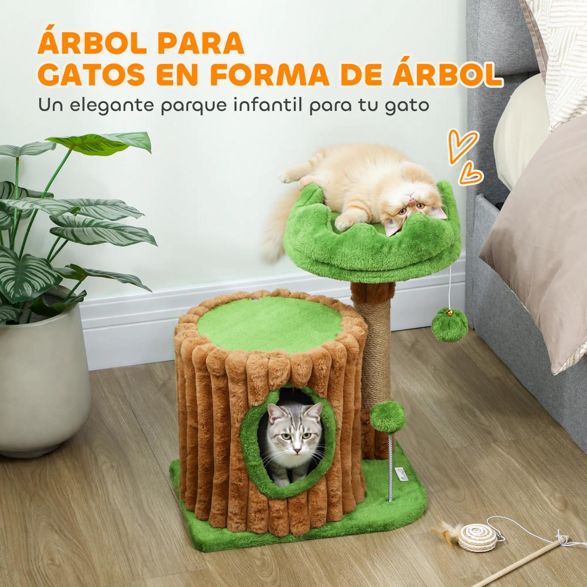 DISEÑO ÚNICO Y DECORATIVO: Este árbol rascador para gatos de PawHut simula un tronco y una copa en tonos marrón y verde, siendo un rascador funcional y un original elemento decorativo para tu hogar