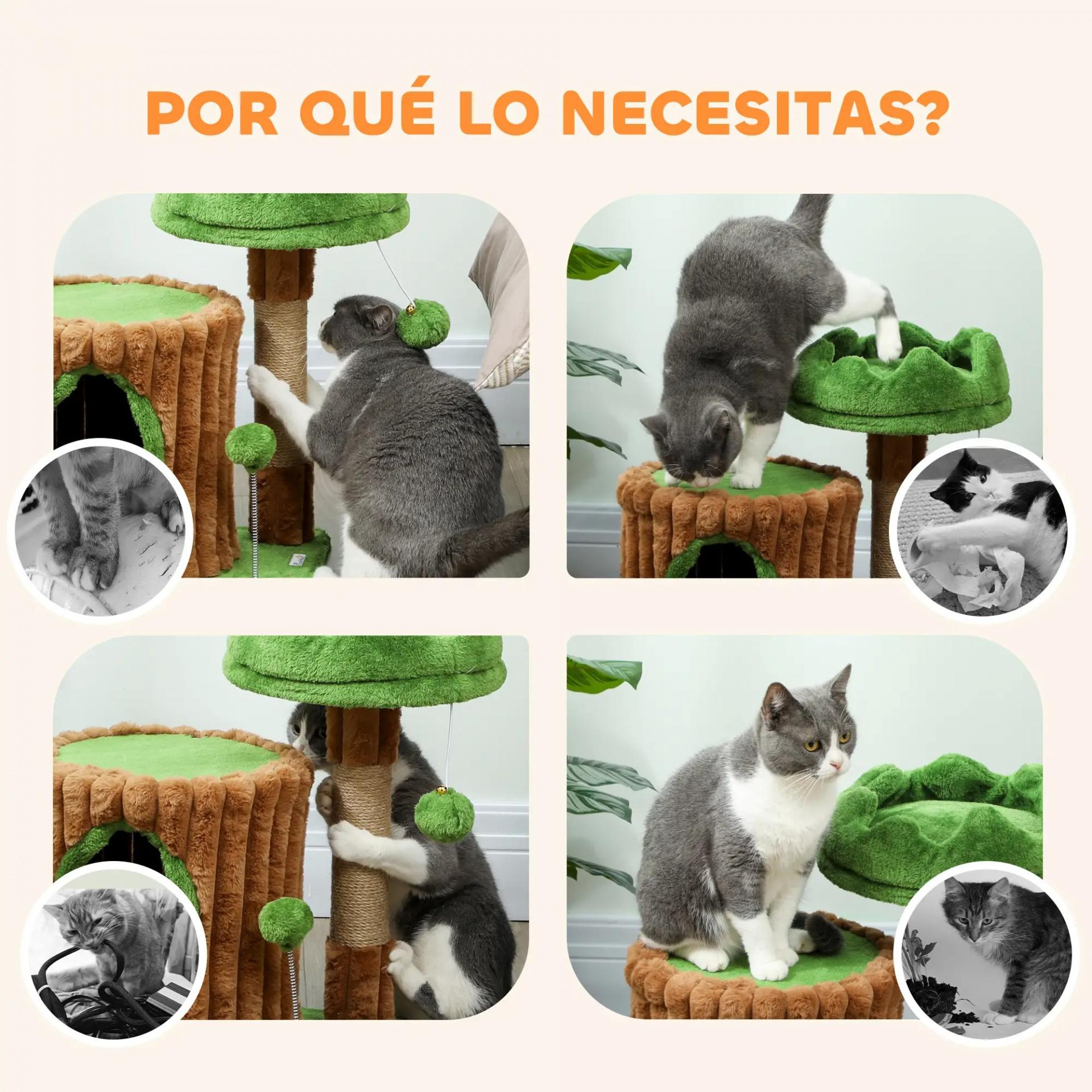 - DIVERSIÓN ASEGURADA: El árbol para gatos cuenta con un escondite y dos pelotas colgantes que estimulan el juego, fomentan el ejercicio y mantienen a tu felino activo y entretenido