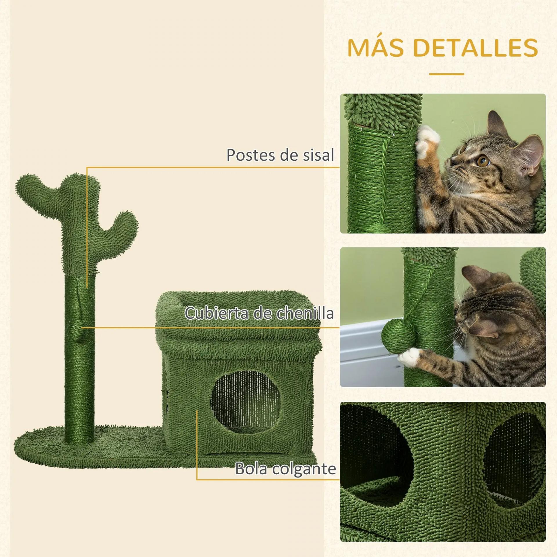 Árbol Rascador para Gatos Diseño de Cactus con Cama Cueva Poste de Sisal y Bola Colgante 68x30x67 cm Verde