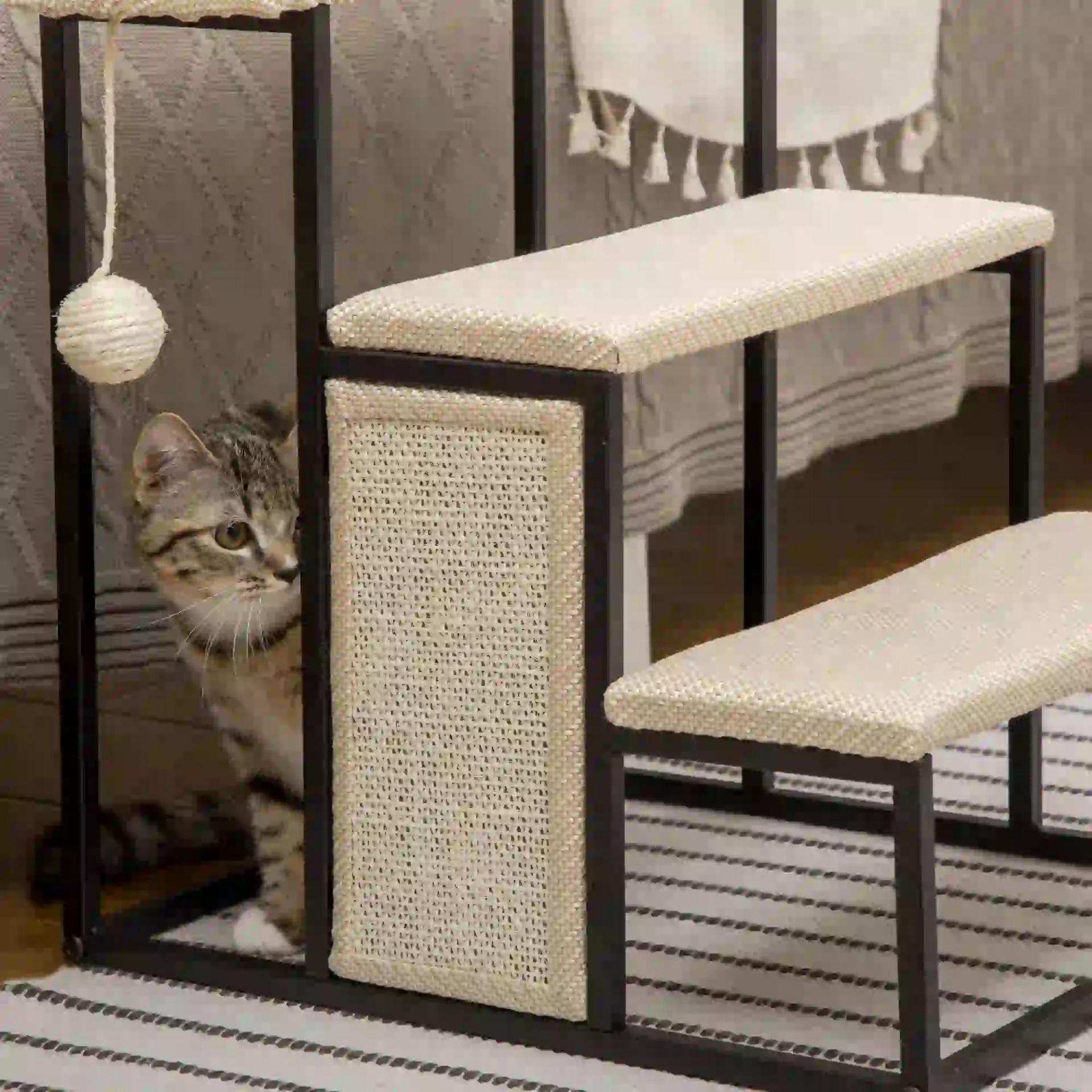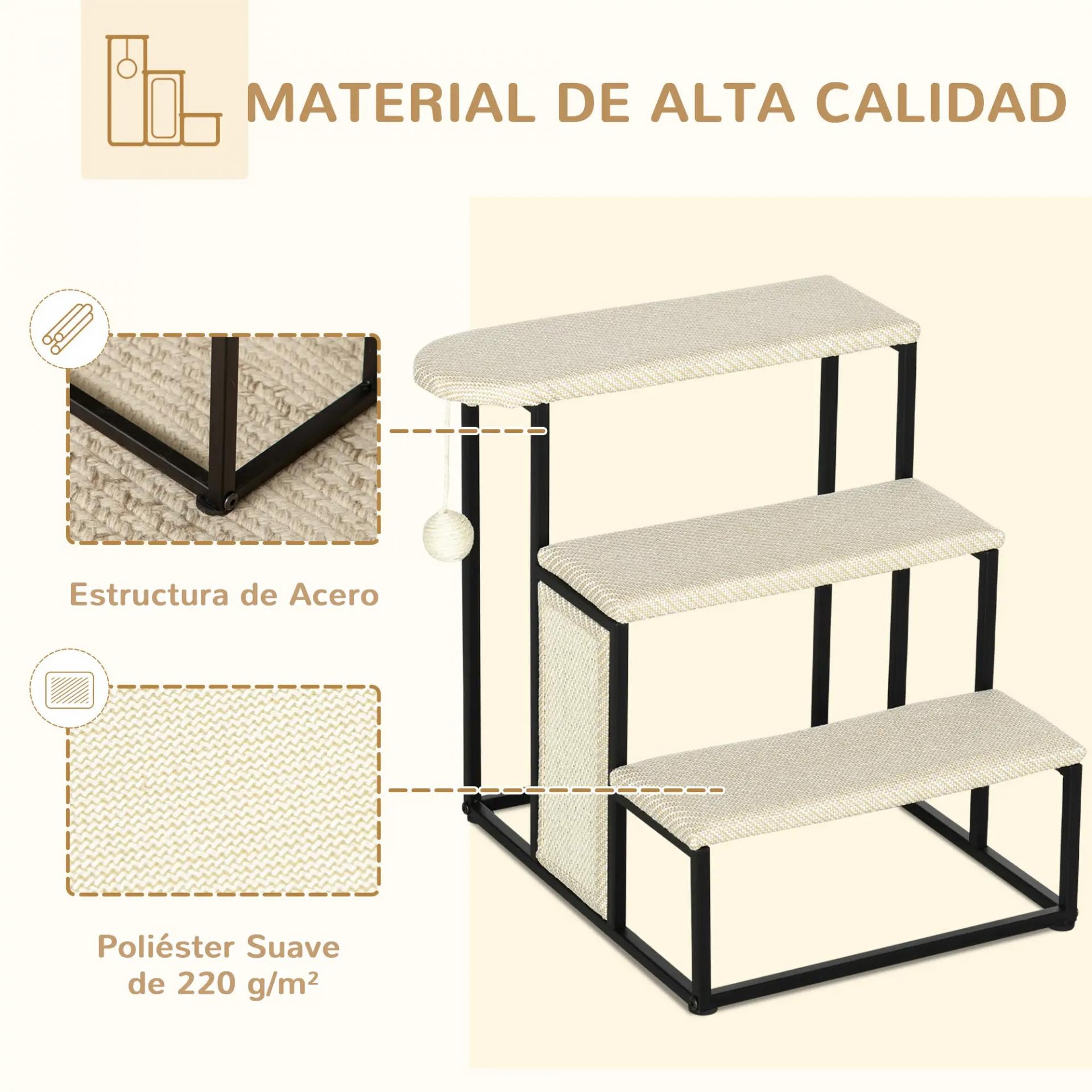 - TABLERO RASCADOR DE SISAL: Esta escalera para perros y gatos para subir a la cama cuenta con peldaños tapizados en un tejido agradable que protege las patas de los animales. Además, incluye un panel lateral de sisal que permite que tu gato afile sus garras sin necesidad de recurrir a tus muebles para ello
