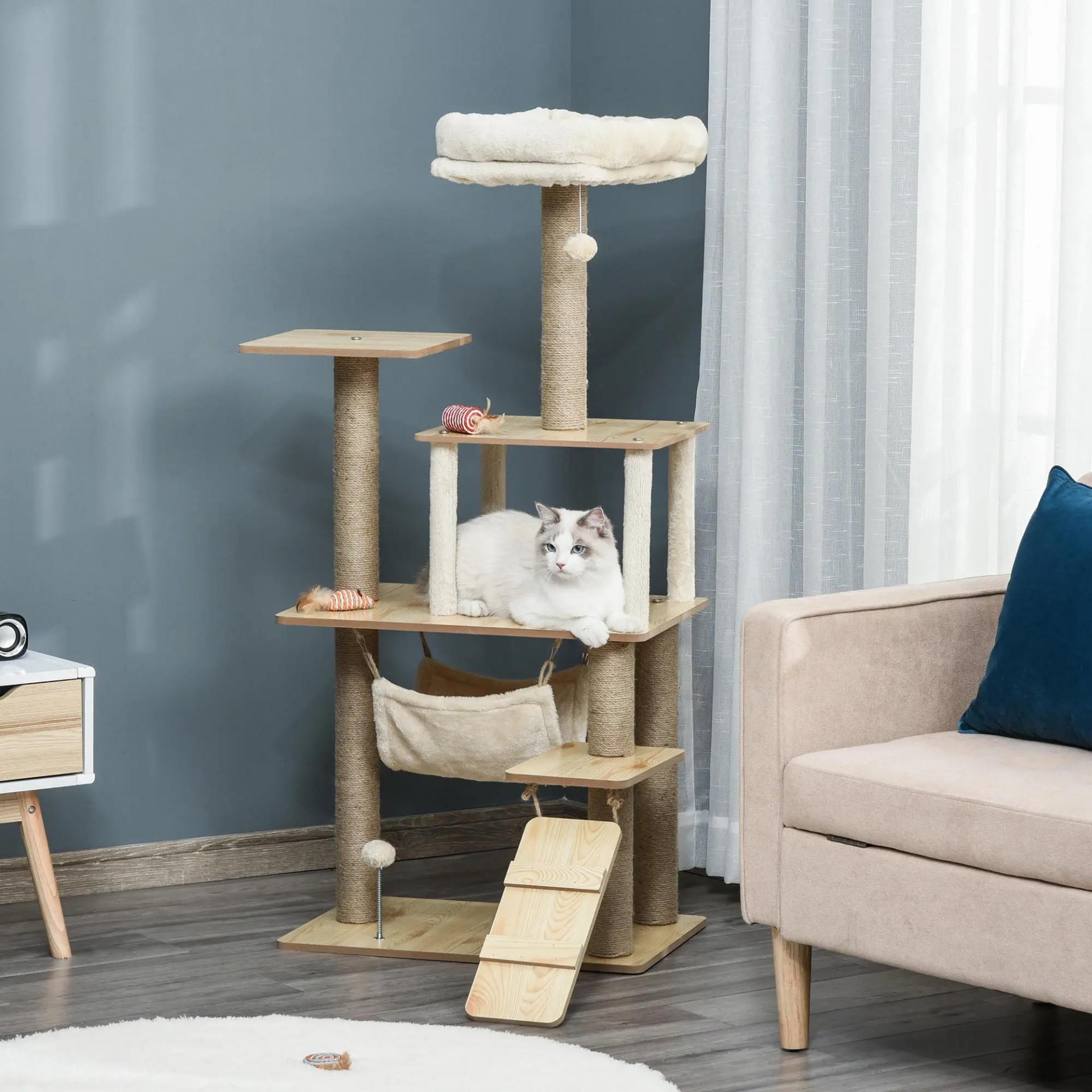 TODO EN UNO: Este árbol rascador para gatos de varios niveles cuenta con postes para rascar de cuerda de yute, varias plataformas, una cueva espaciosa, una hamaca, una escalera y dos juguetes (una bola colgante y una con muelle)
