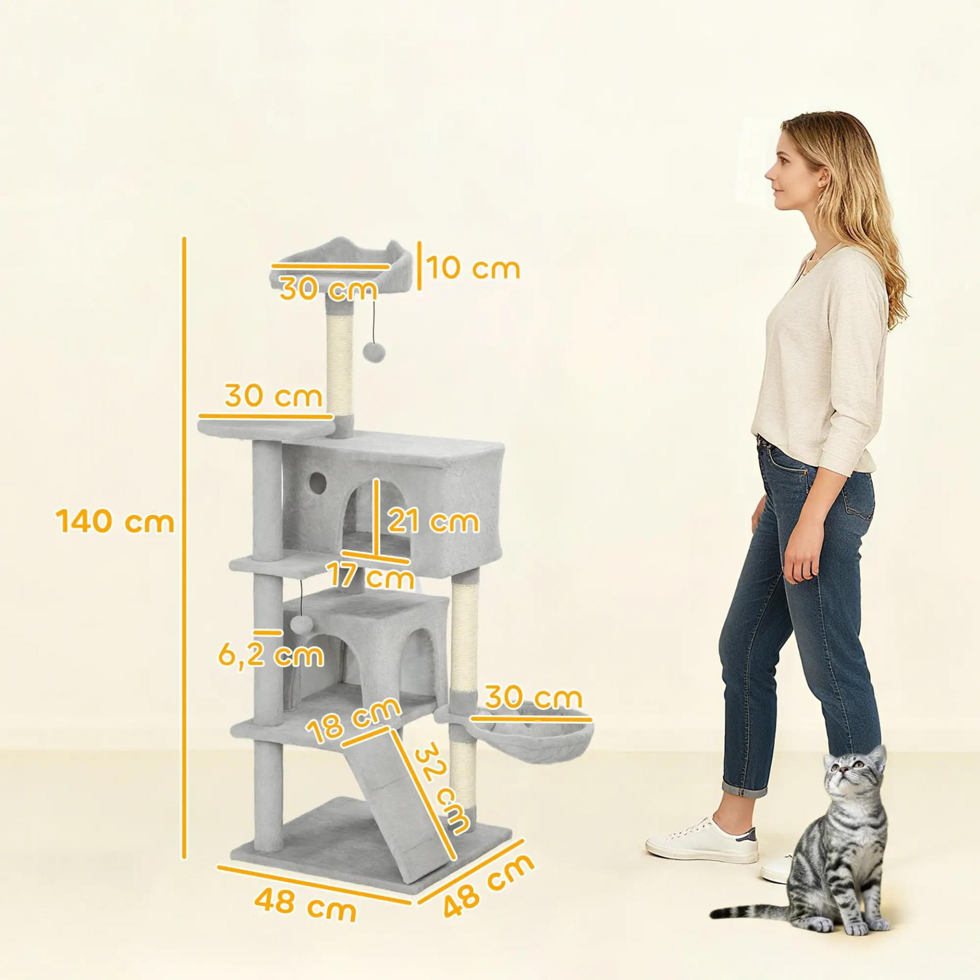 Árbol Rascador para Gatos 140 cm con Plataformas Cama 2 Cuevas Hamaca Escalera Postes de Sisal Gris Claro