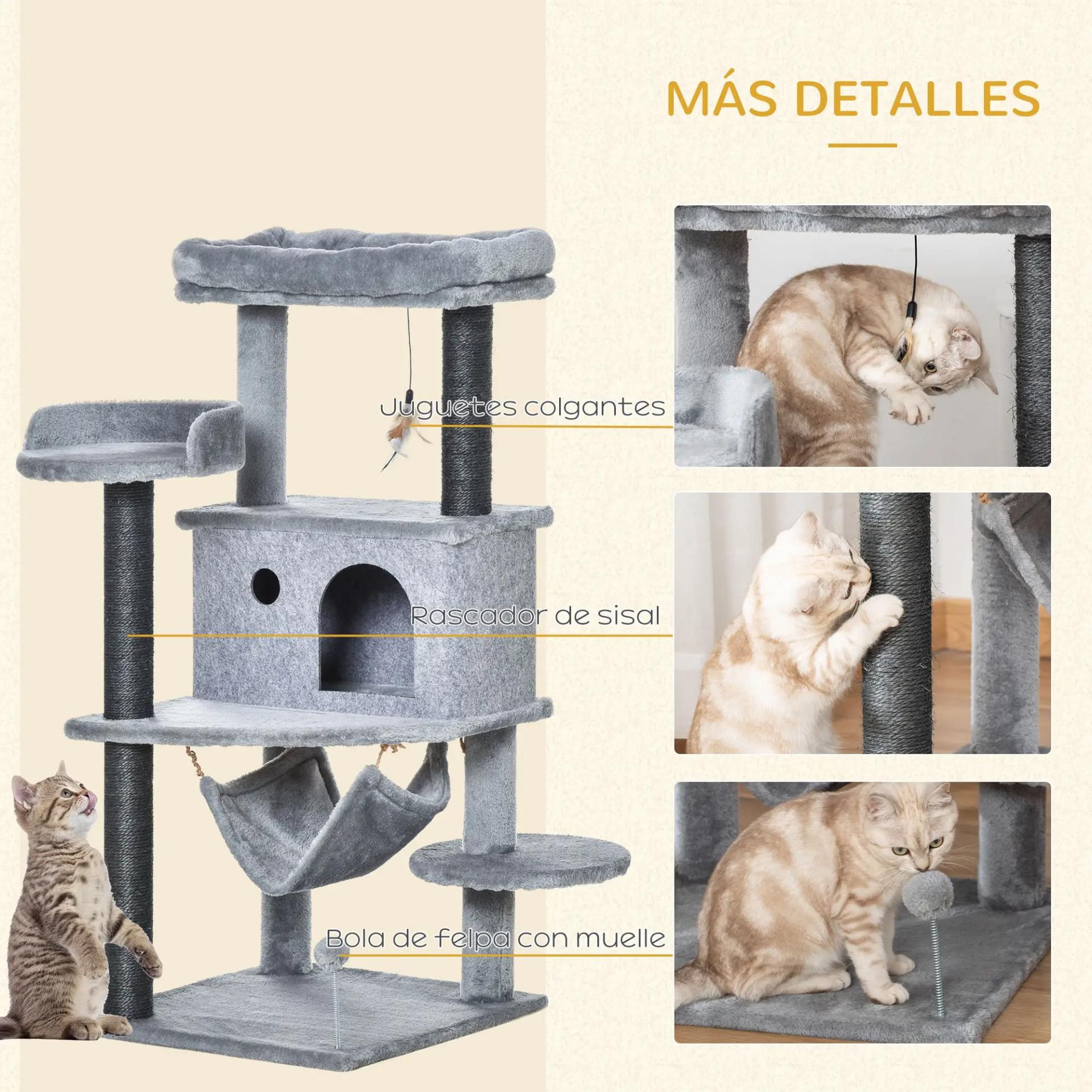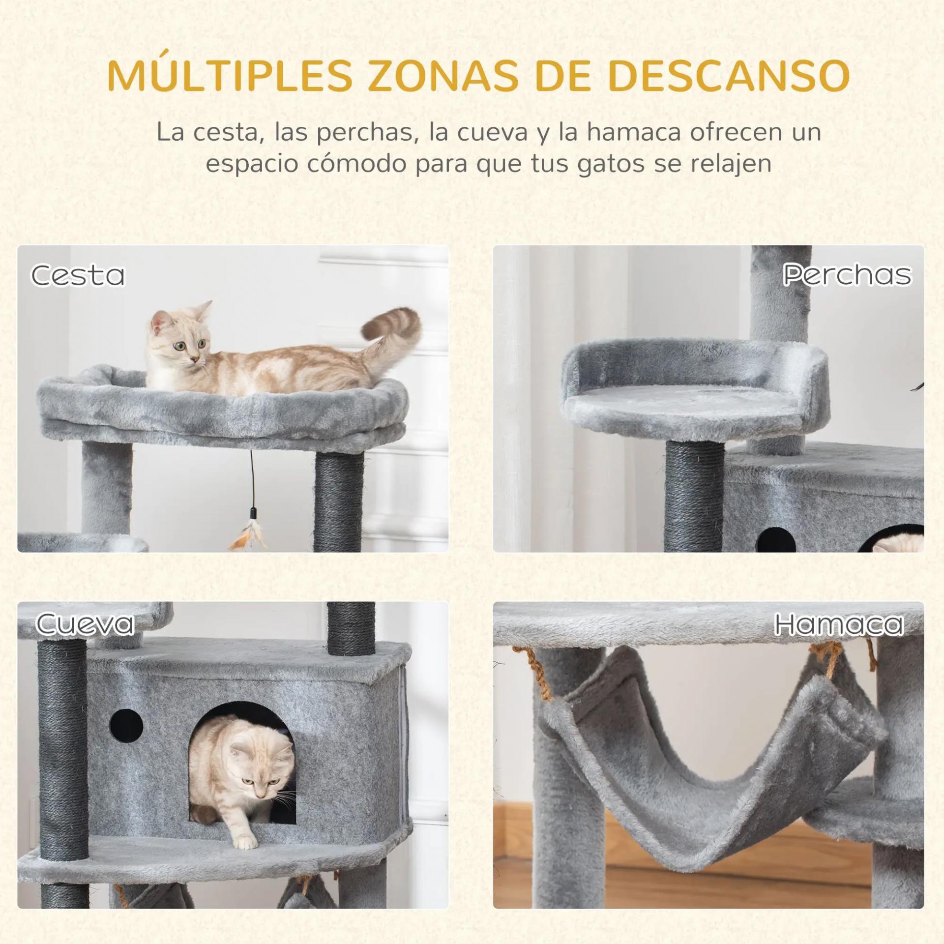 - PROTEGE TUS MUEBLES: Con postes recubiertos con cuerda de sisal, este árbol para gatos ofrece un lugar ideal para que tus gatos puedan afilar sus garras y satisfacer su instinto de rascado, evitando que dañen alfombras, muebles, cortinas y más