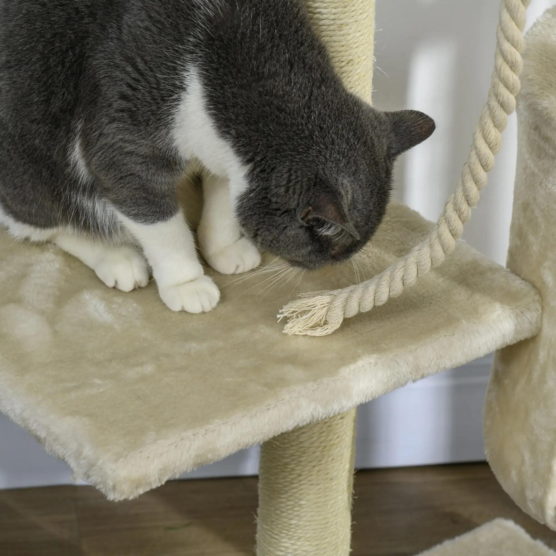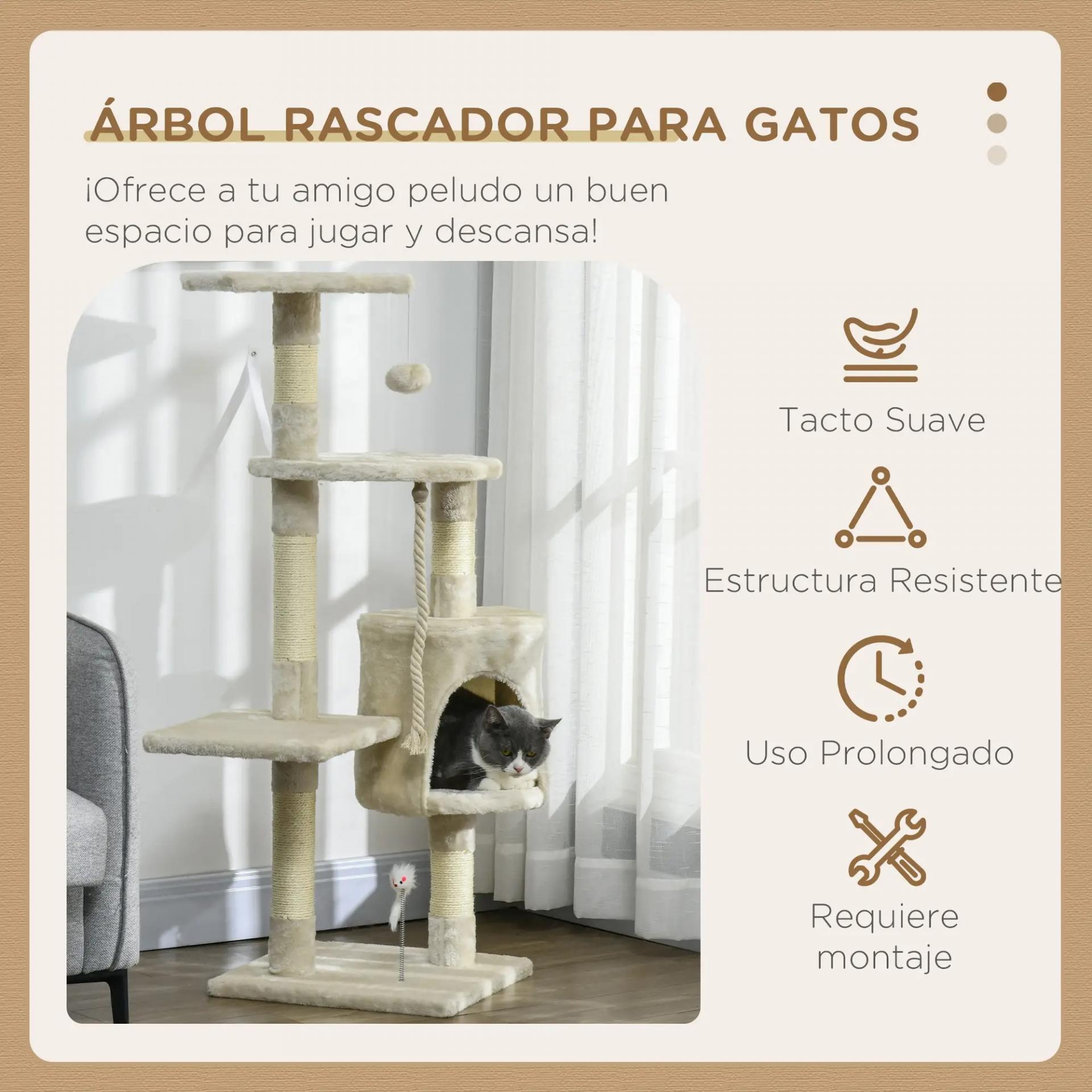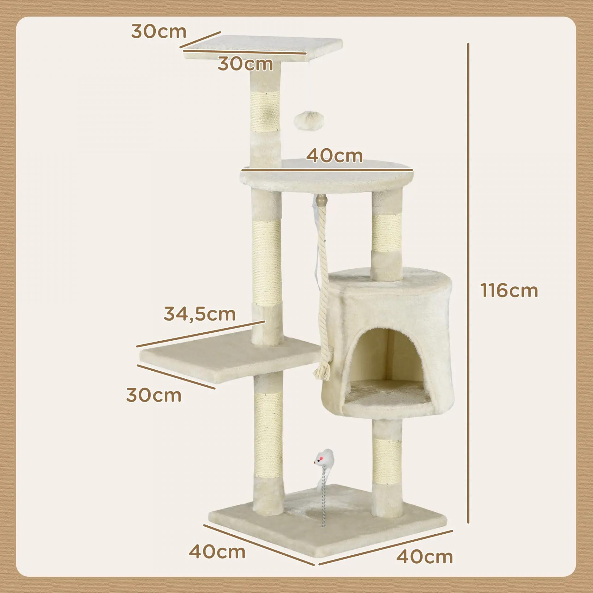 Rascador para Gatos Altura 116 cm Árbol para Gatos Torre de Escalada con Postes Rascadores de Sisal Cueva Plataformas y Juguetes Divertidos Colgantes Beige