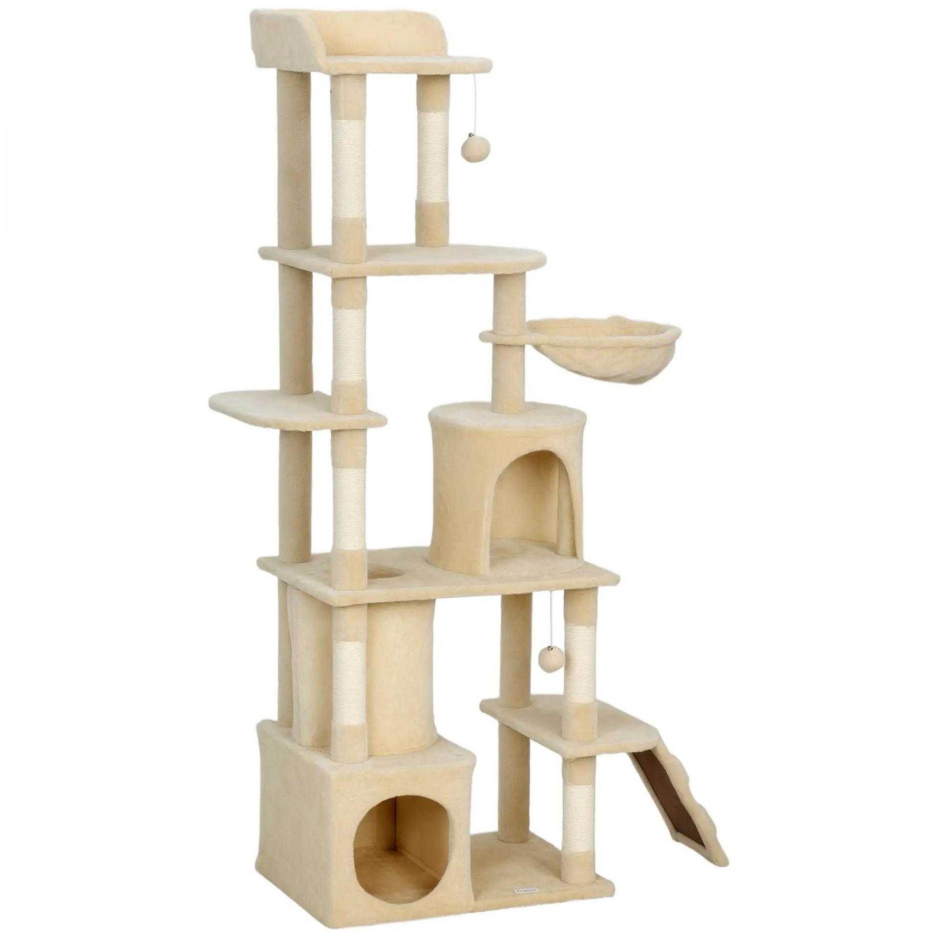 Árbol Rascador para Gatos Grande Altura 170 cm con 7 Postes 1 Túnel 3 Plataformas 2 Cuevas 1 Hamaca Beige