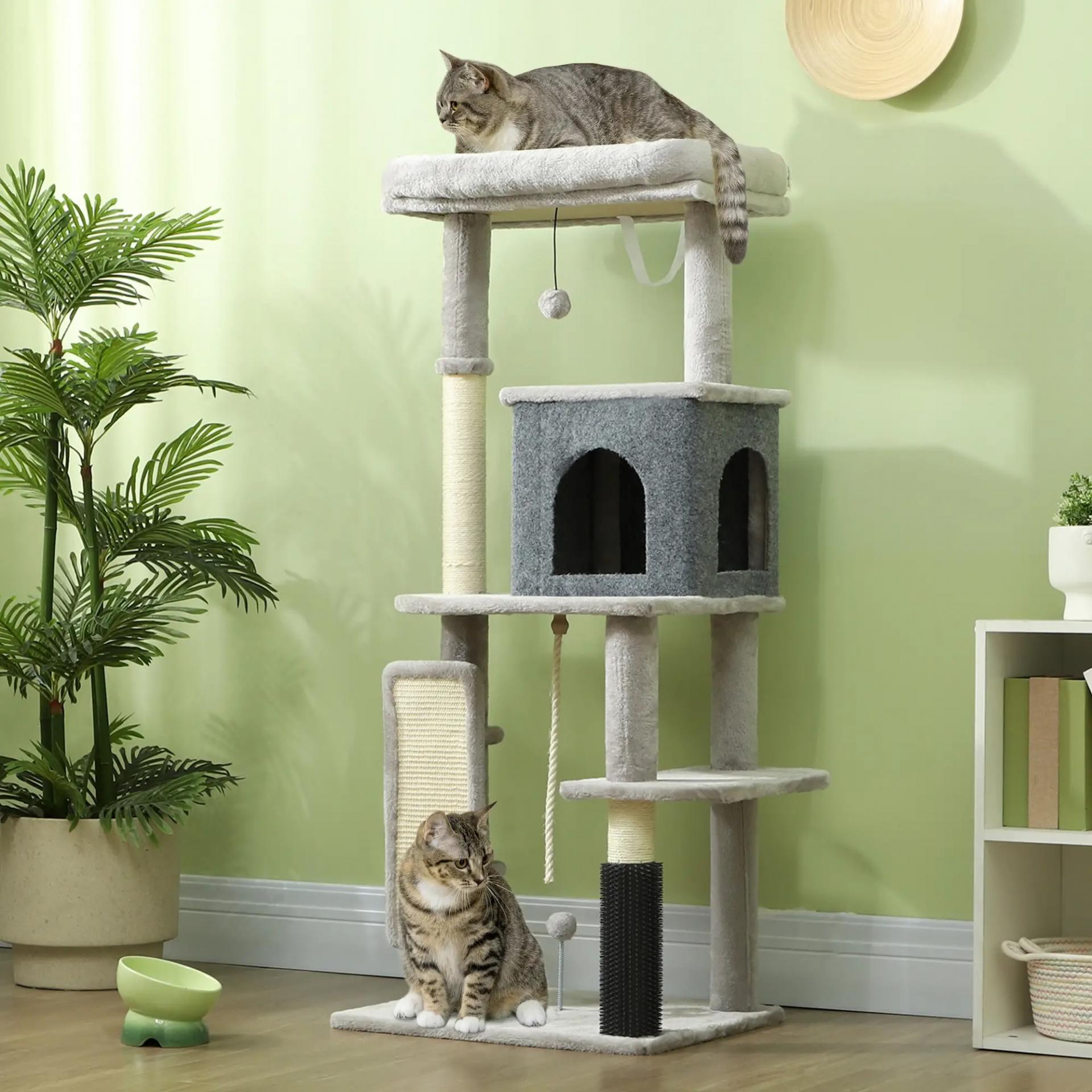 Árbol Rascador para Gatos 132 cm con Plataformas Poste con Cepillo Bolas Colgantes y Almohadilla para Rascar Gris Claro