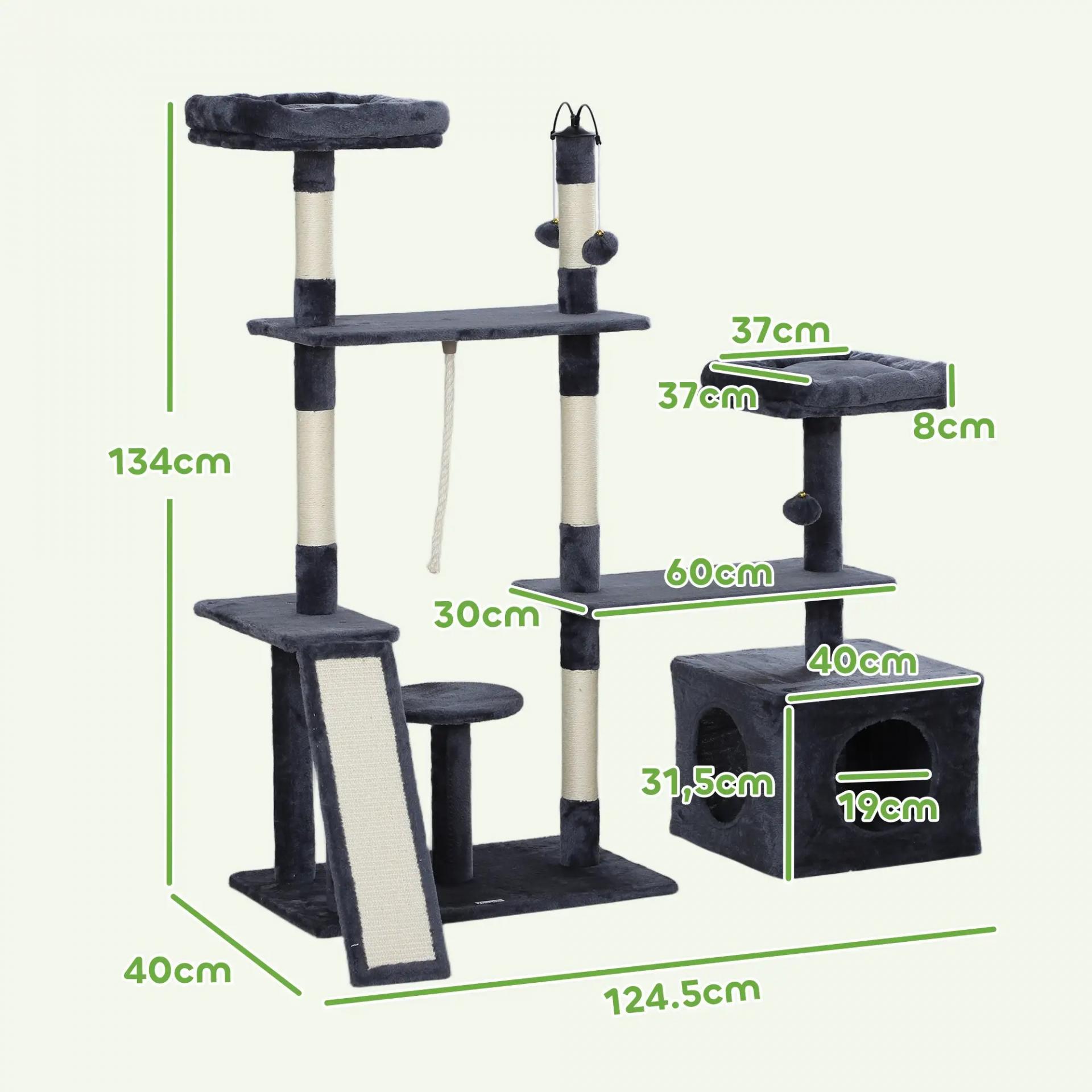Rascador para Gatos 134 cm Torre para Gatos con Nidos Plataformas Bolas de Juguete y Postes de Sisal Gris Oscuro
