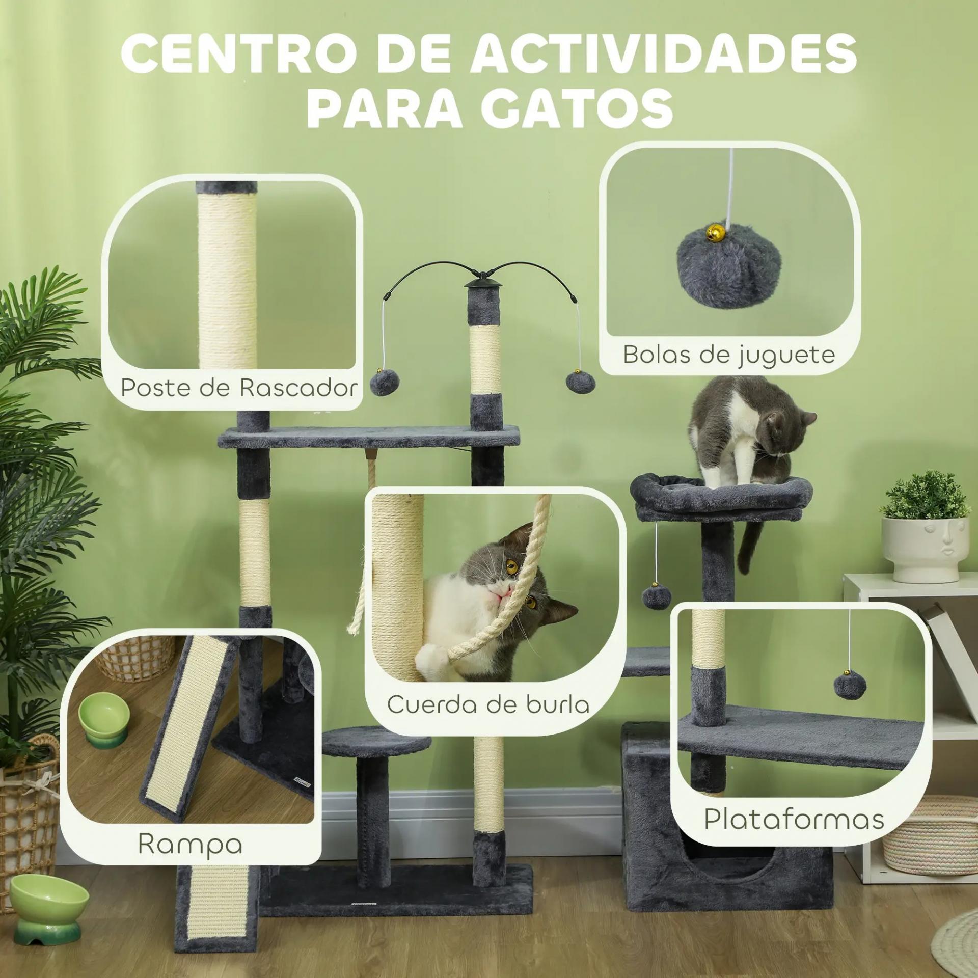 CENTRO DE ACTIVIDADES COMPLETO: Este árbol para gatos incluye postes para rascar, una rampa, dos camas, una casita, cuatro plataformas y juguetes, proporcionando una zona integral de juego y descanso para tu felino