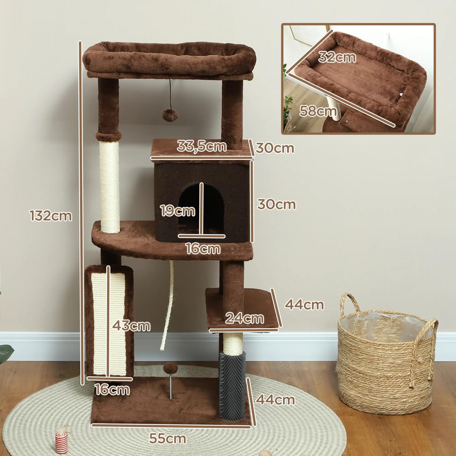 Árbol Rascador para Gatos 132 cm con Plataformas Poste con Cepillo Bolas Colgantes y Almohadilla para Rascar Marrón