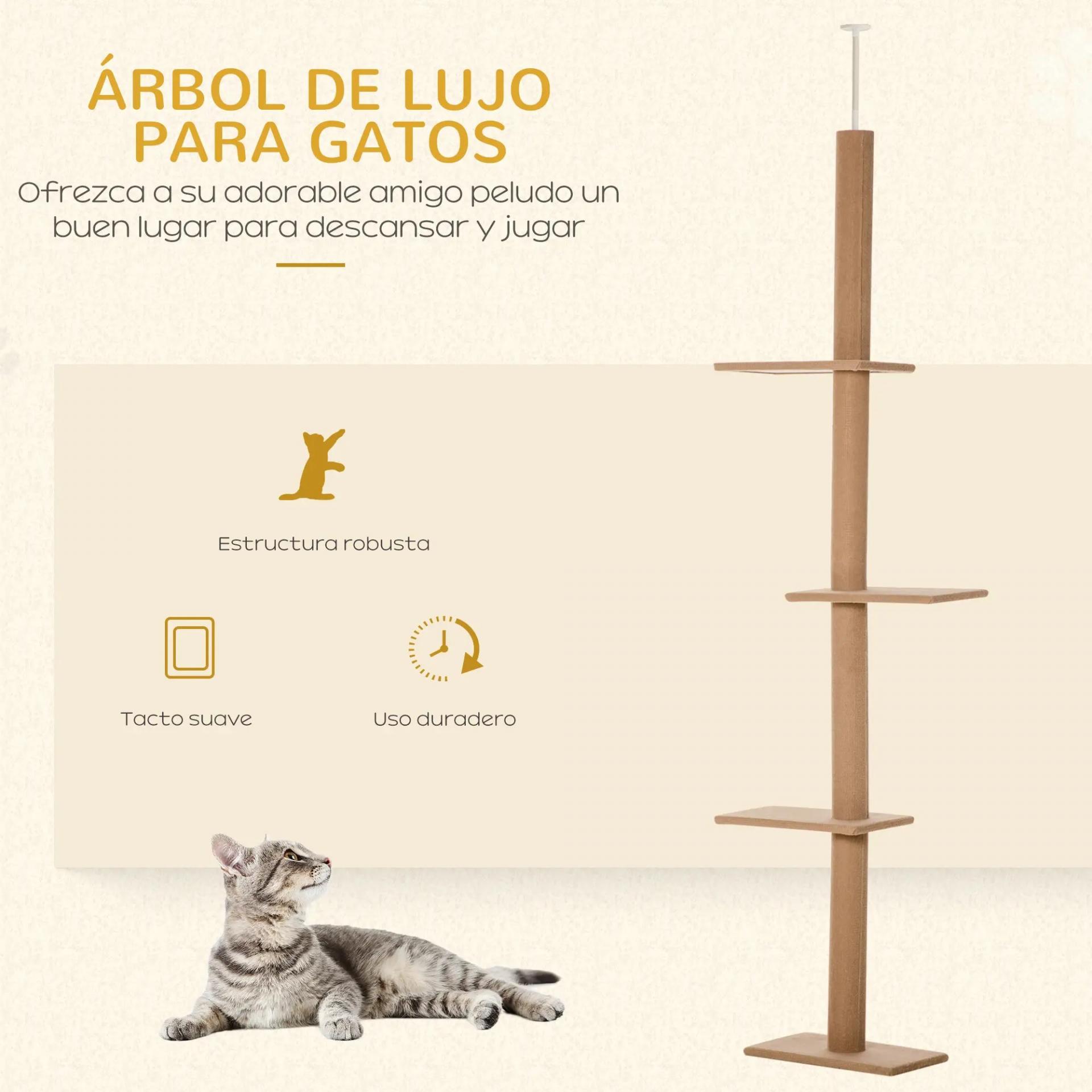 Árbol Rascador para Gatos de Suelo a Techo Torre para Gatos con Altura Ajustable 43x27x228-260 cm Marrón Claro y Beige