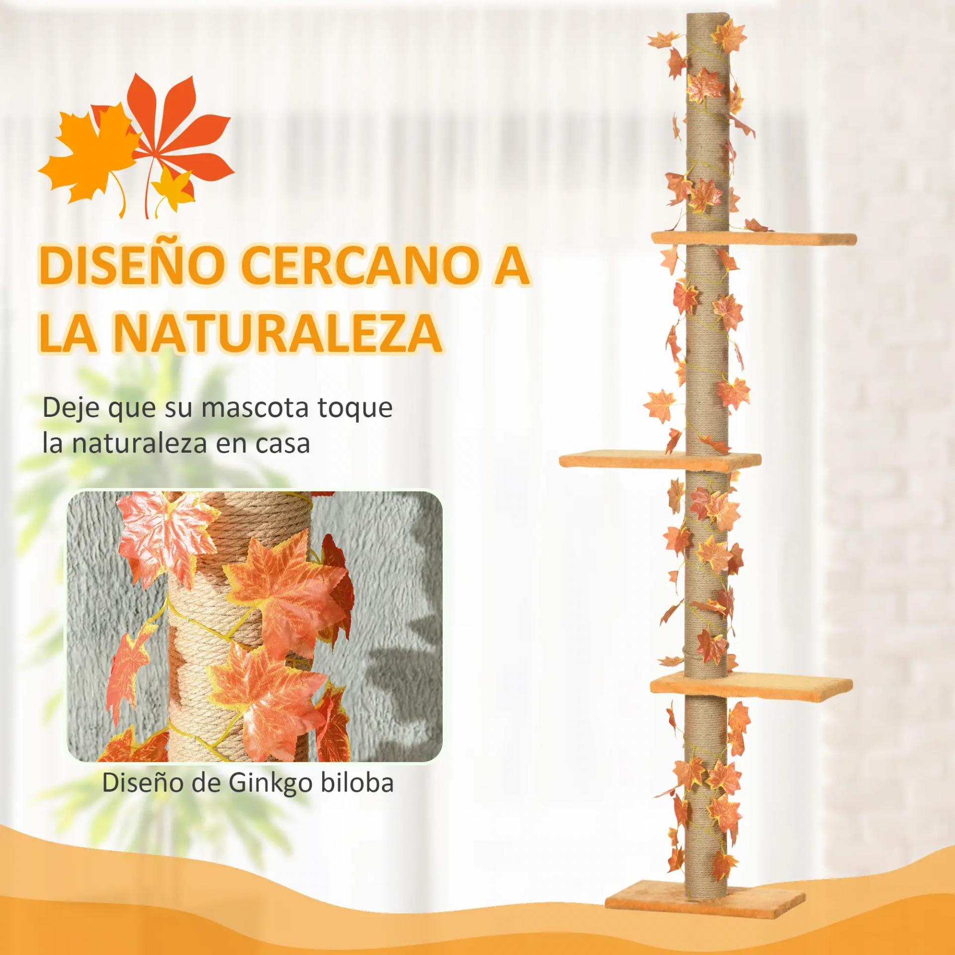 Árbol para Gatos de Suelo a Techo de 202-242 cm con 3 Plataformas Altura Ajustable y Decoración de Hoja de Arce Naranja