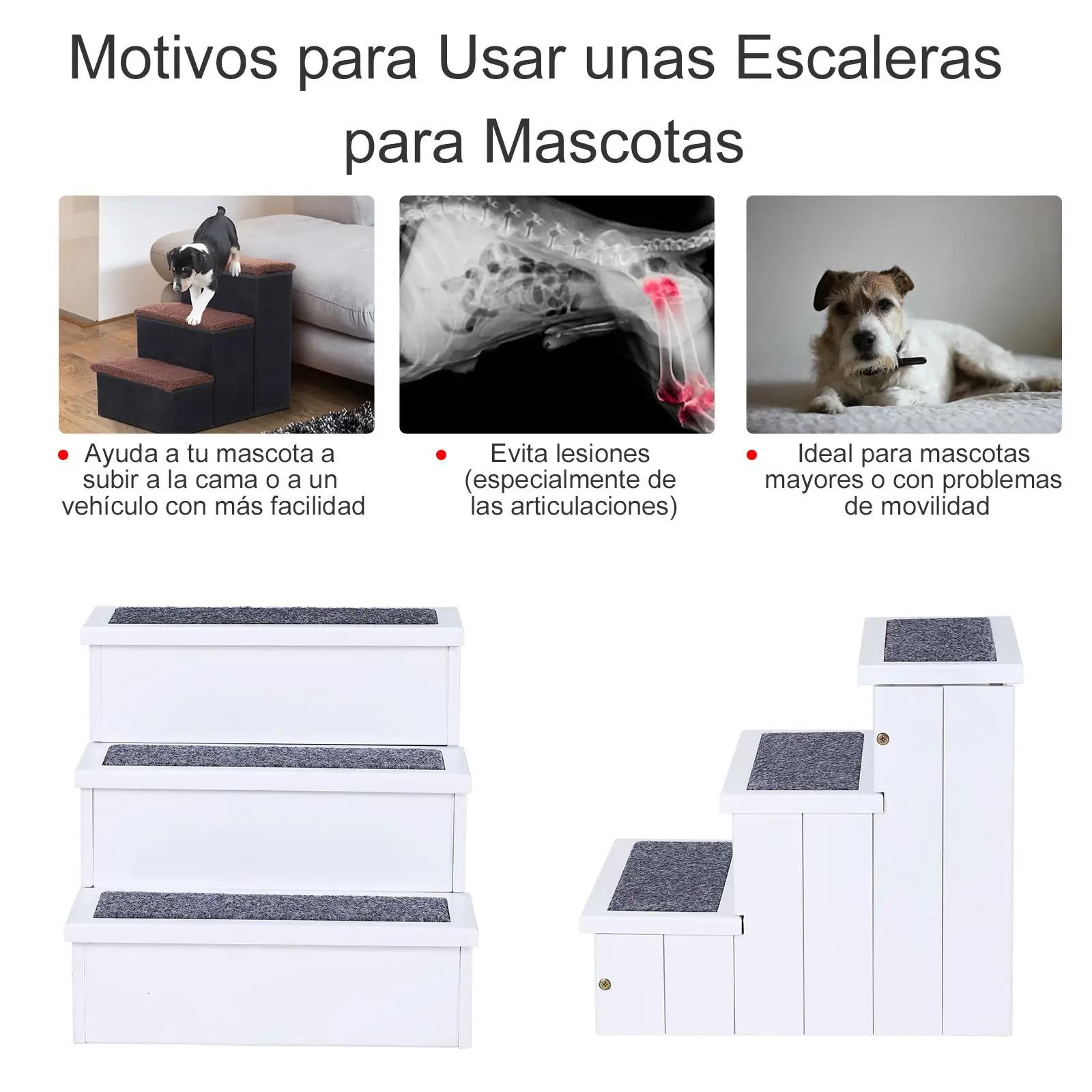 - PELDAÑOS ANTIDESLIZANTES: Los peldaños de estas escaleras están cubiertos de tejido de moqueta antideslizantes para proteger las patas de tu mascota y evitar que se caigan o resbalen mientras trepan