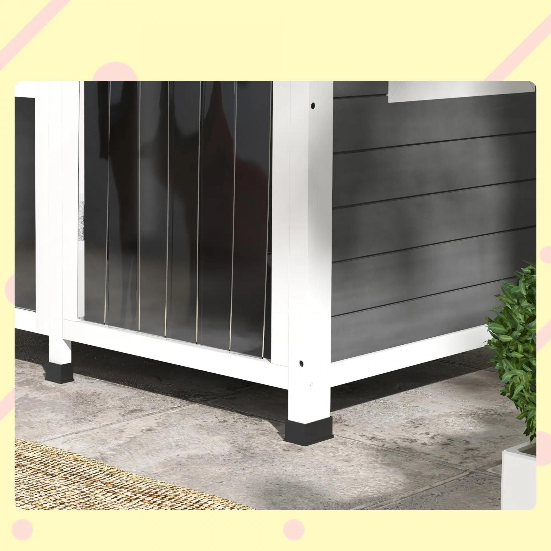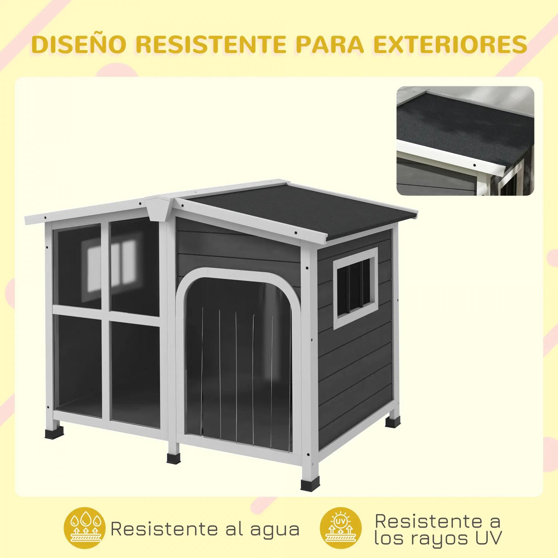 DECORATIVA Y FÁCIL DE LIMPIAR: El techo se abre, ofreciendo una buena ventilación y permitiendo alcanzar y acariciar a tu perro o darle algo. Esta caseta para perros de exterior también cuenta con suelo extraíble para poder limpiarla por completo. Su bonito diseño de casita ofrece un aspecto hogareño para una bonita adición a tu patio posterior, terraza o jardín