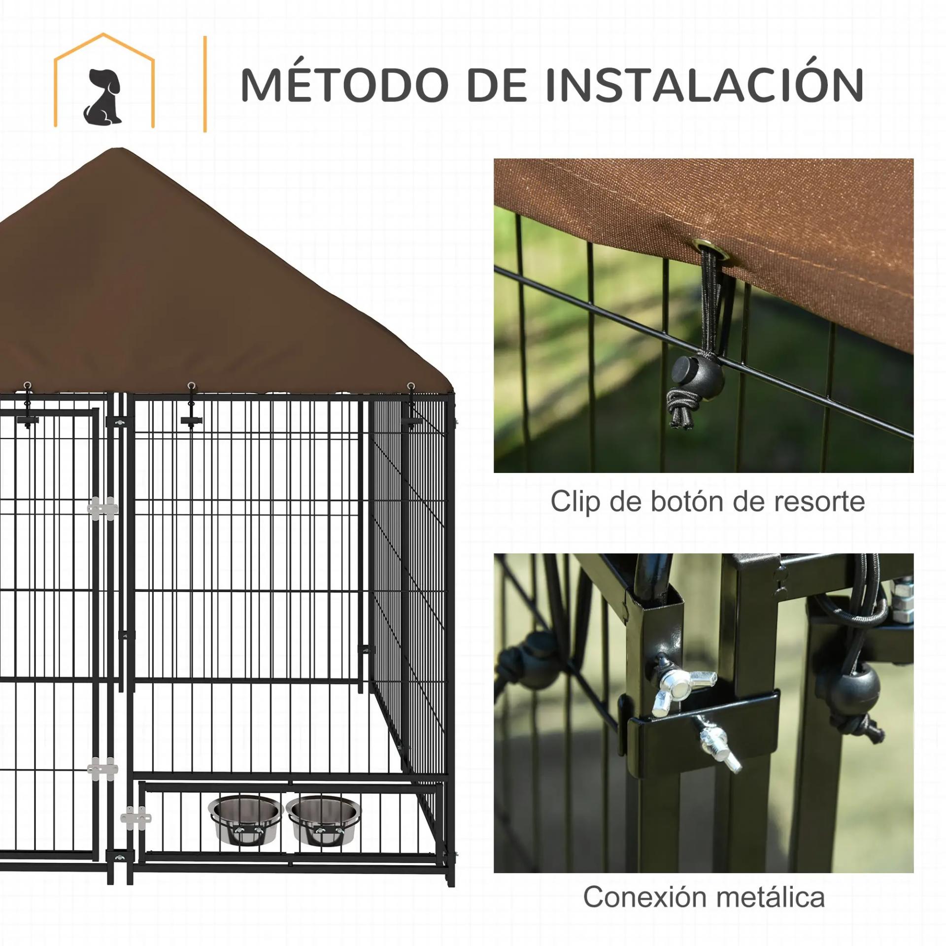 - CON TOLDO: Esta jaula exterior perra viene con una cubierta de tela Oxford resistente a la intemperie, repelente al agua y con protección UV. Para que puedas instalarla sin problemas al exterior