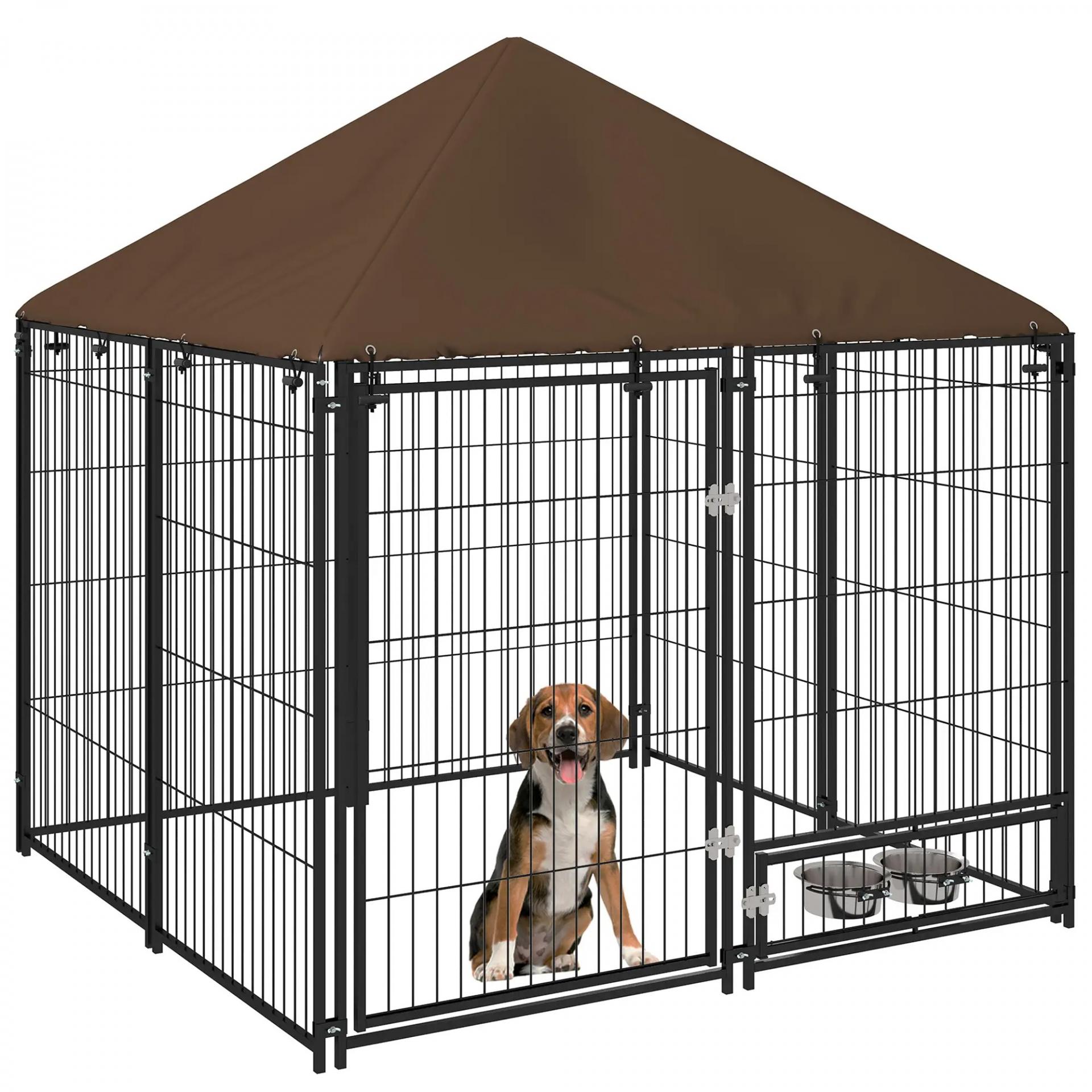 Perrera con Toldo y Soporte Giratorio para Comida 2 Cuencos Incluidos 141x141x151 cm Negro