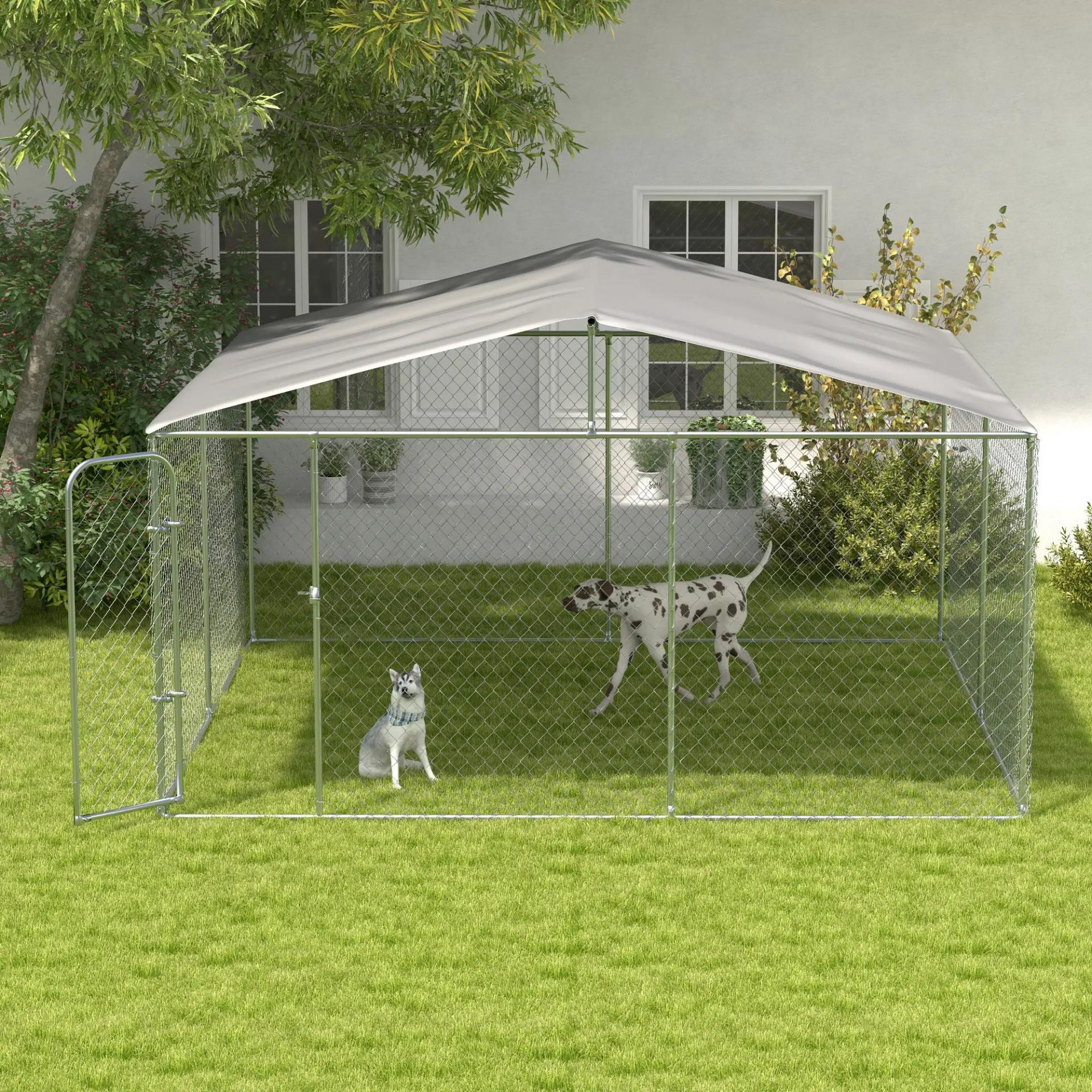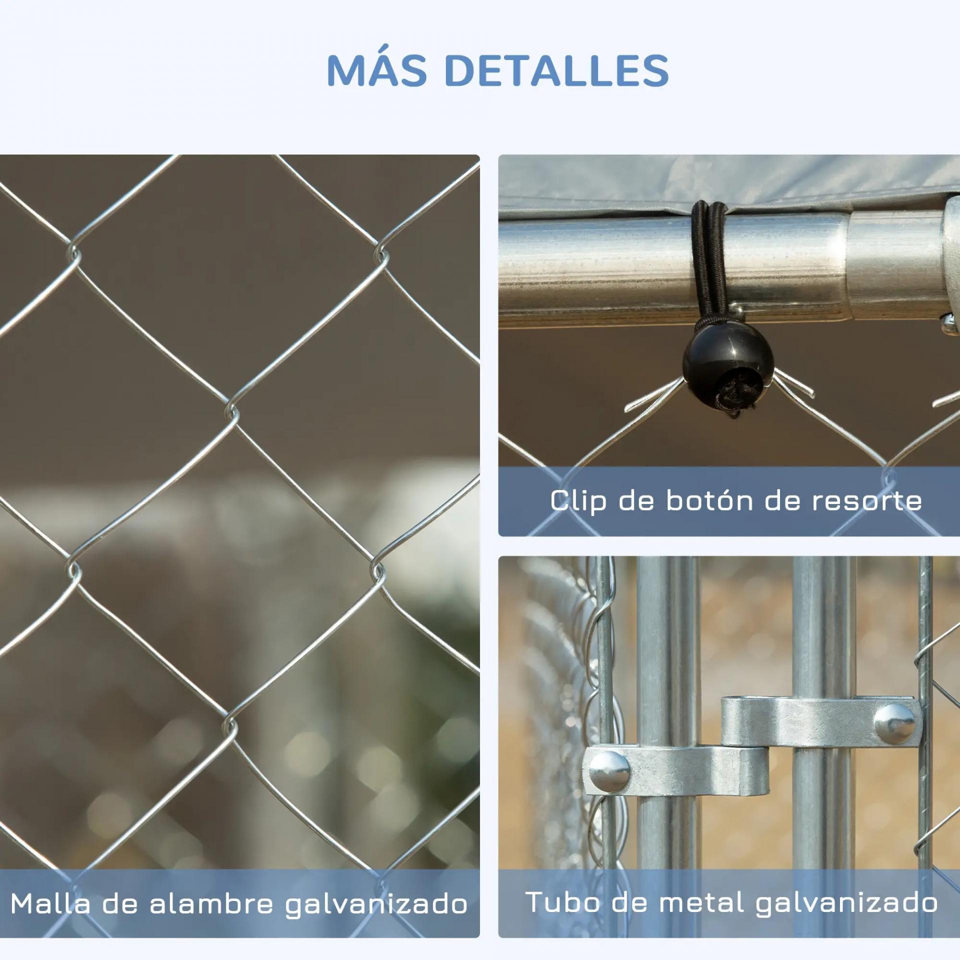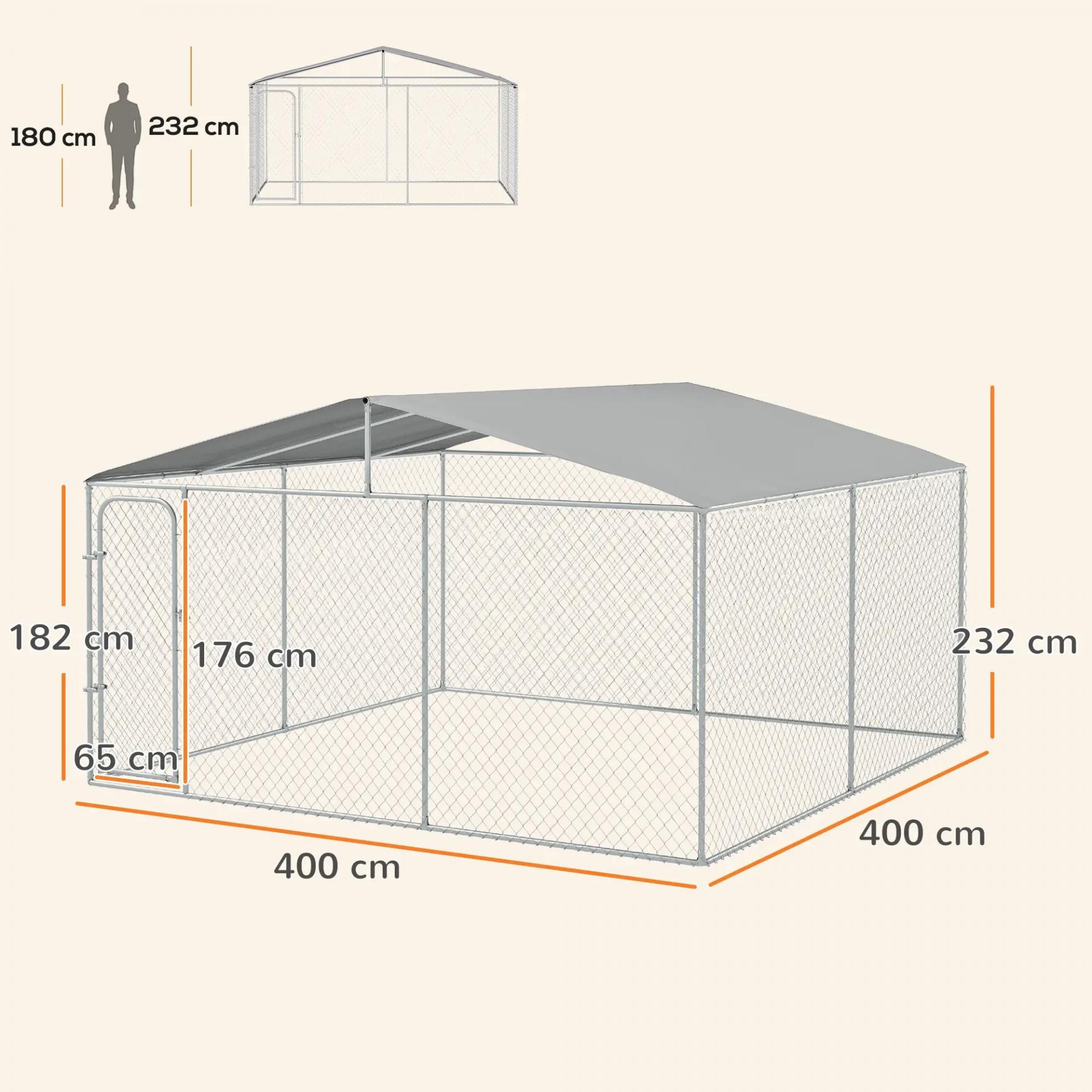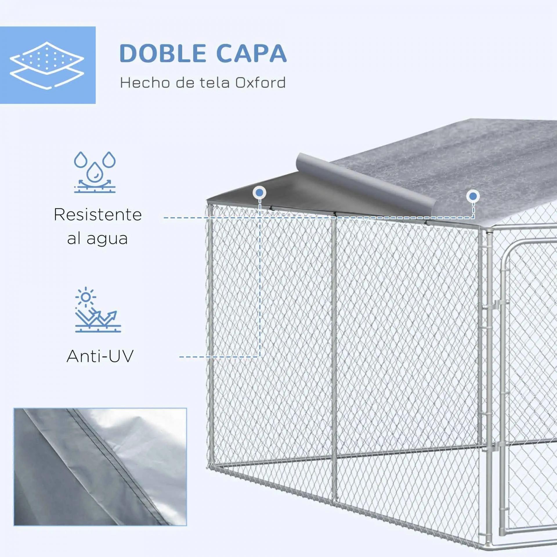 Perrera de Exterior con Toldo Anti-UV Impermeable Puerta con Pestillo y Marco de Metal Galvanizado 4x4x2,3 m Plata