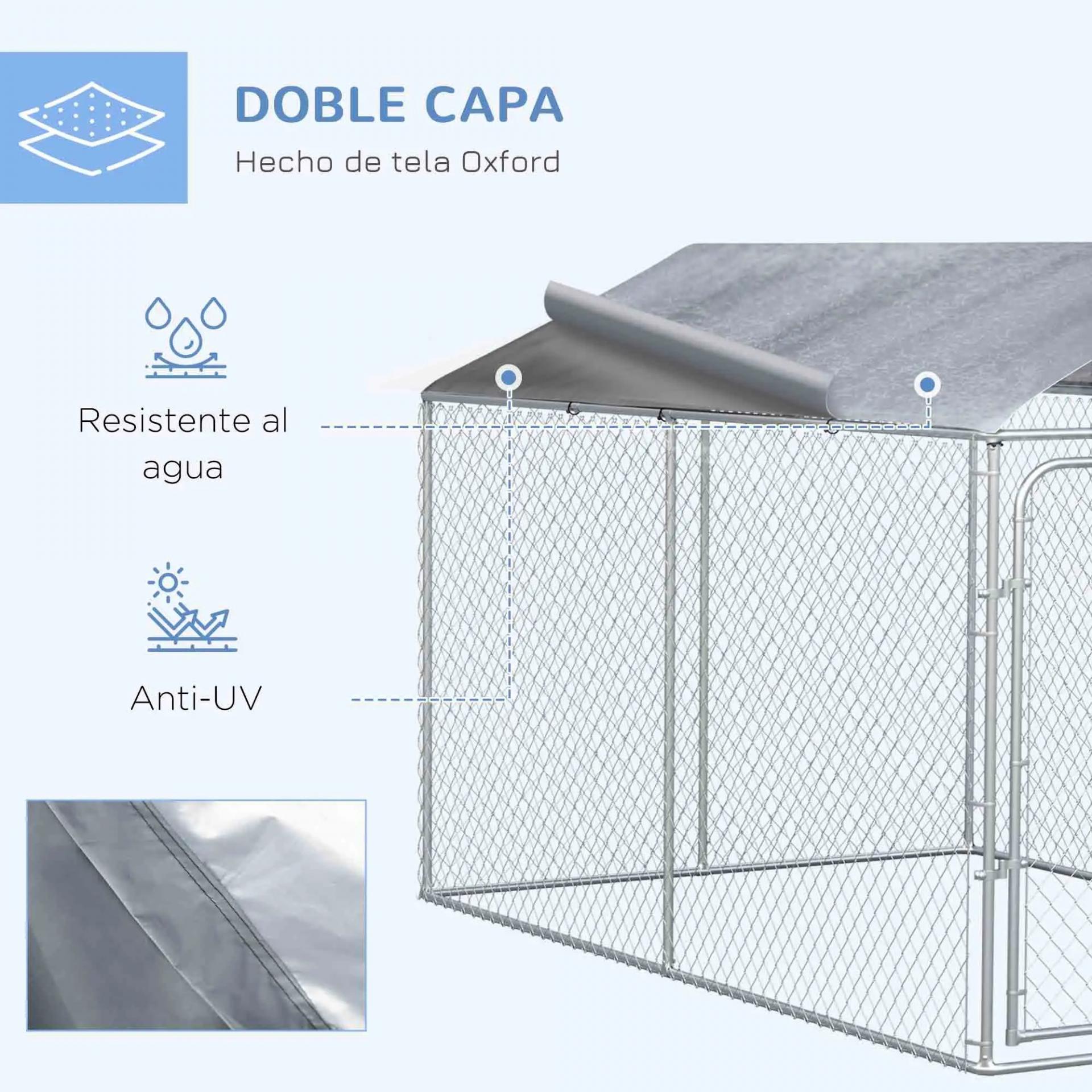 Perrera de Exterior con Toldo Anti-UV Impermeable Puerta con Pestillo y Marco de Metal Galvanizado 4x2,3x2,3 m Plata