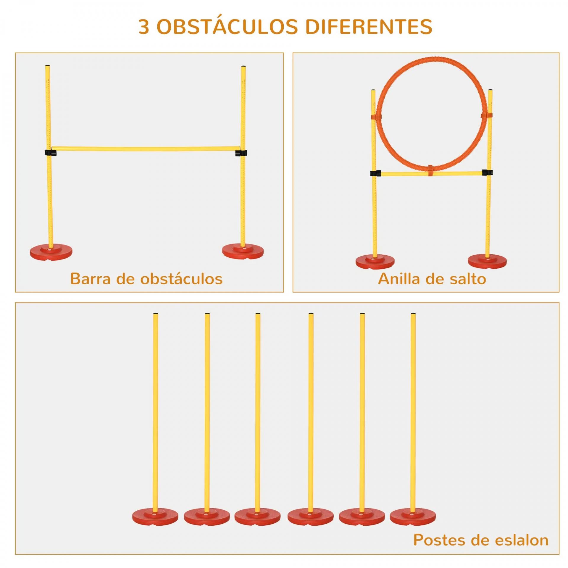 MEDIDAS TOTALES: Medidas del anillo de salto: 90x23x100 cm (LxANxAL). Medidas del obstáculo de salto de altura: 128x23x9-100 cm (LxANxAL). Medidas de los postes de slalom: 23x100 cm (ANxAL)