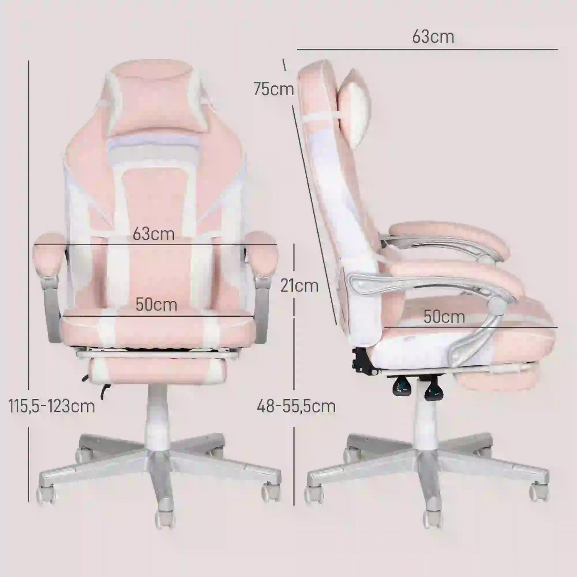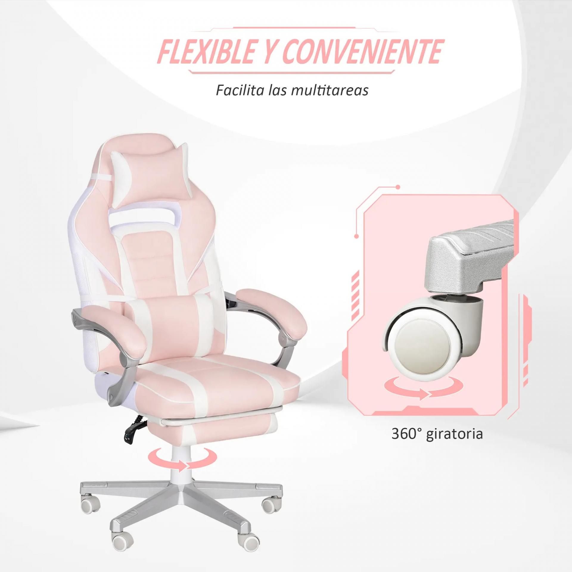 Silla Gamer Reclinable con Altura Ajustable Reposapiés Retráctil Soporte Lumbar y Reposacabezas Desmontable Rosa