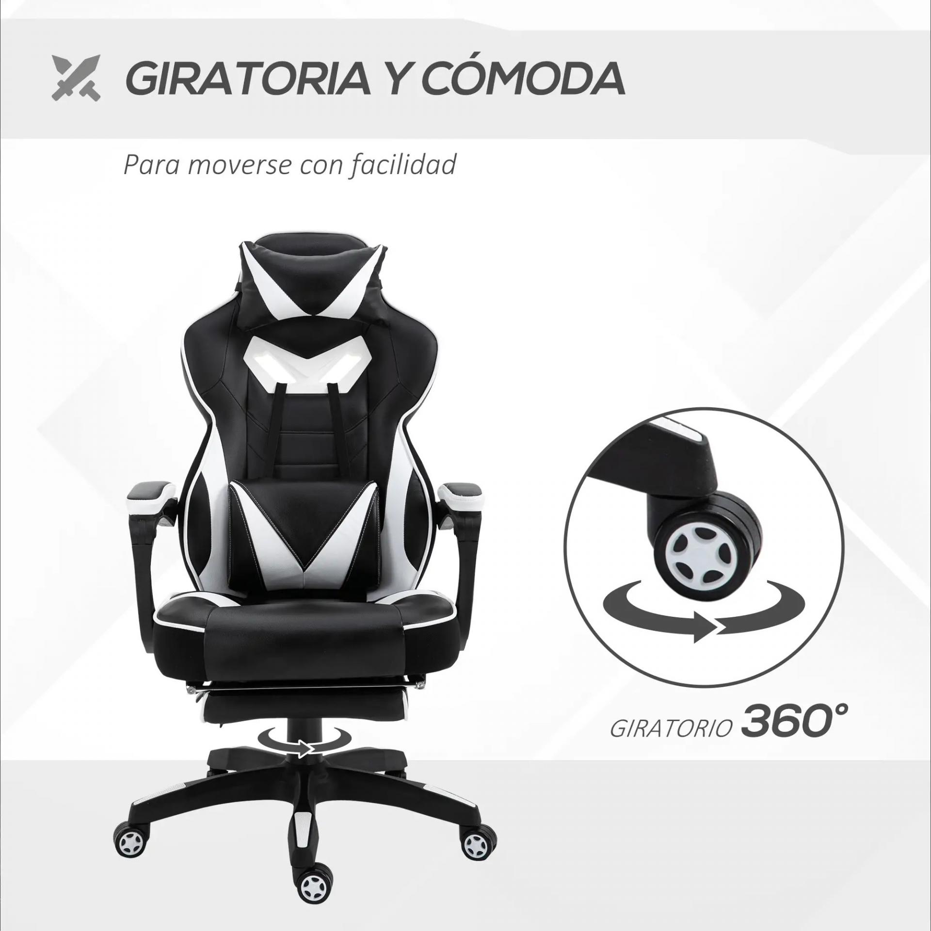 SILLA DE OFICINA CON REPOSAPIÉS: Ideal para trabajar o relajarte jugando en el ordenador, esta silla gaming destaca por su acolchado. Sus cojines extra en la zona lumbar y reposacabezas ofrecen confort, y su giro 360° proporciona libertad de movimiento