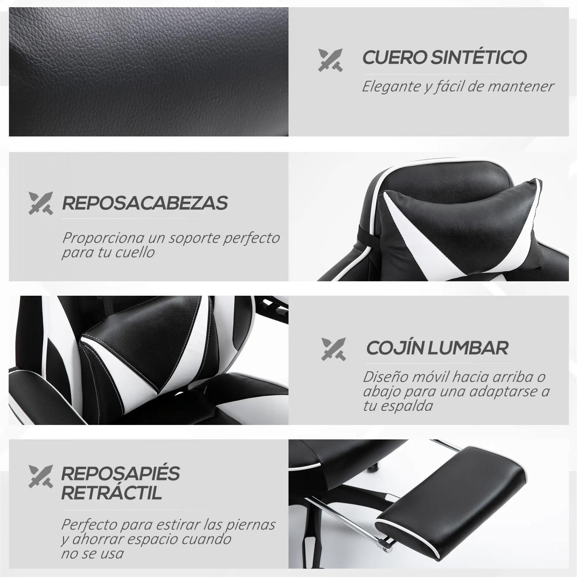 Silla Gaming Ergonómica Silla de Escritorio de Oficina Regulable en Altura Reclinable Respaldo con Reposapiés Reposacabezas Cojín Lumbar Ruedas 65x70x118,5-128,5 cm Blanco