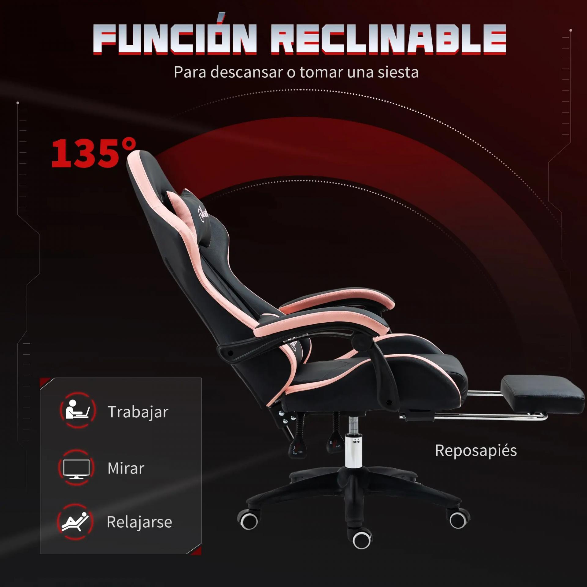 Silla Gaming Silla Gamer de Cuero PU Reclinable 135° Reposacabezas y Reposapiés 65x65x121-129 cm Negro y Rosa