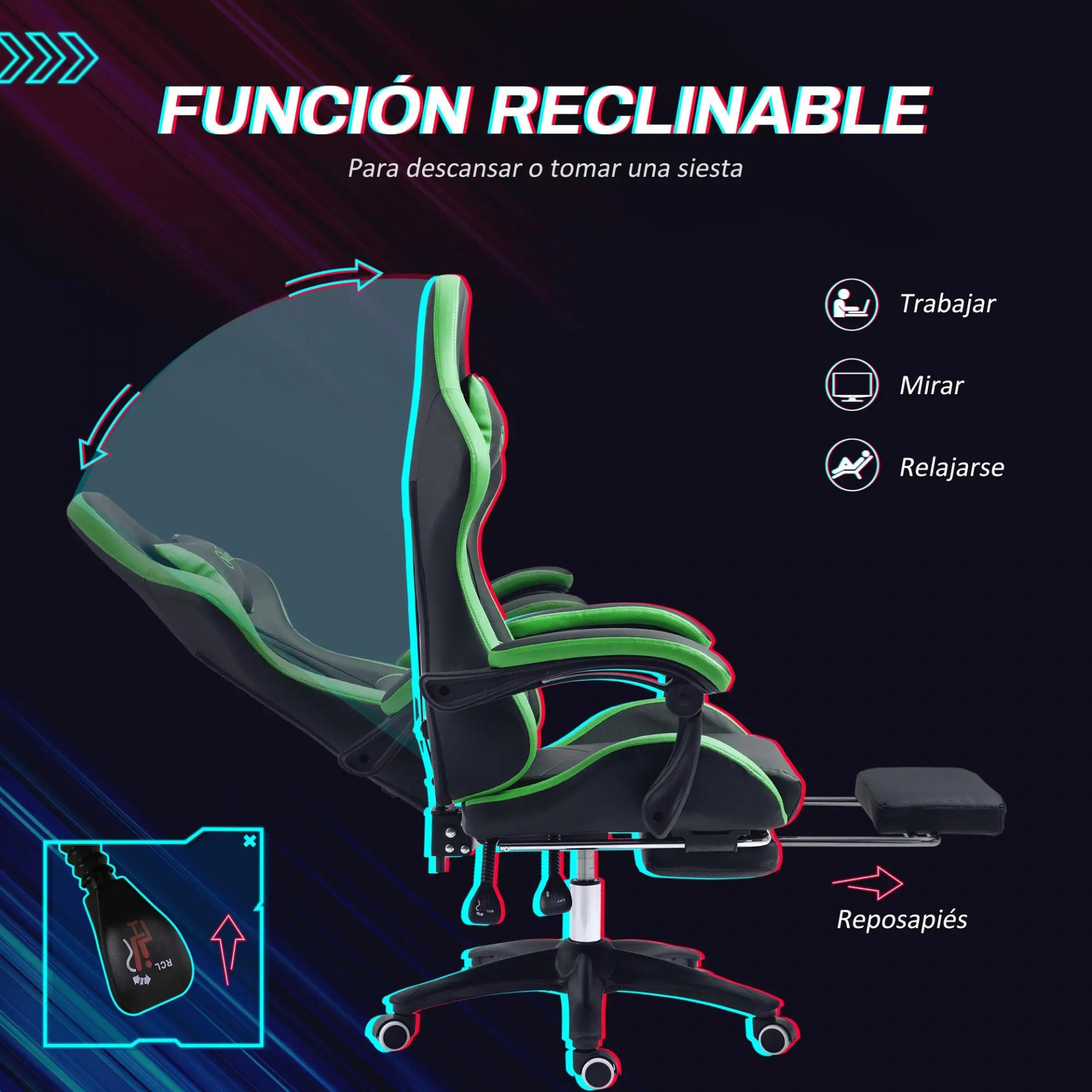 Silla Gaming de Cuero Sintético Reclinable 135° Reposacabezas y Reposapiés 65x65x121-129cm Negro y Verde