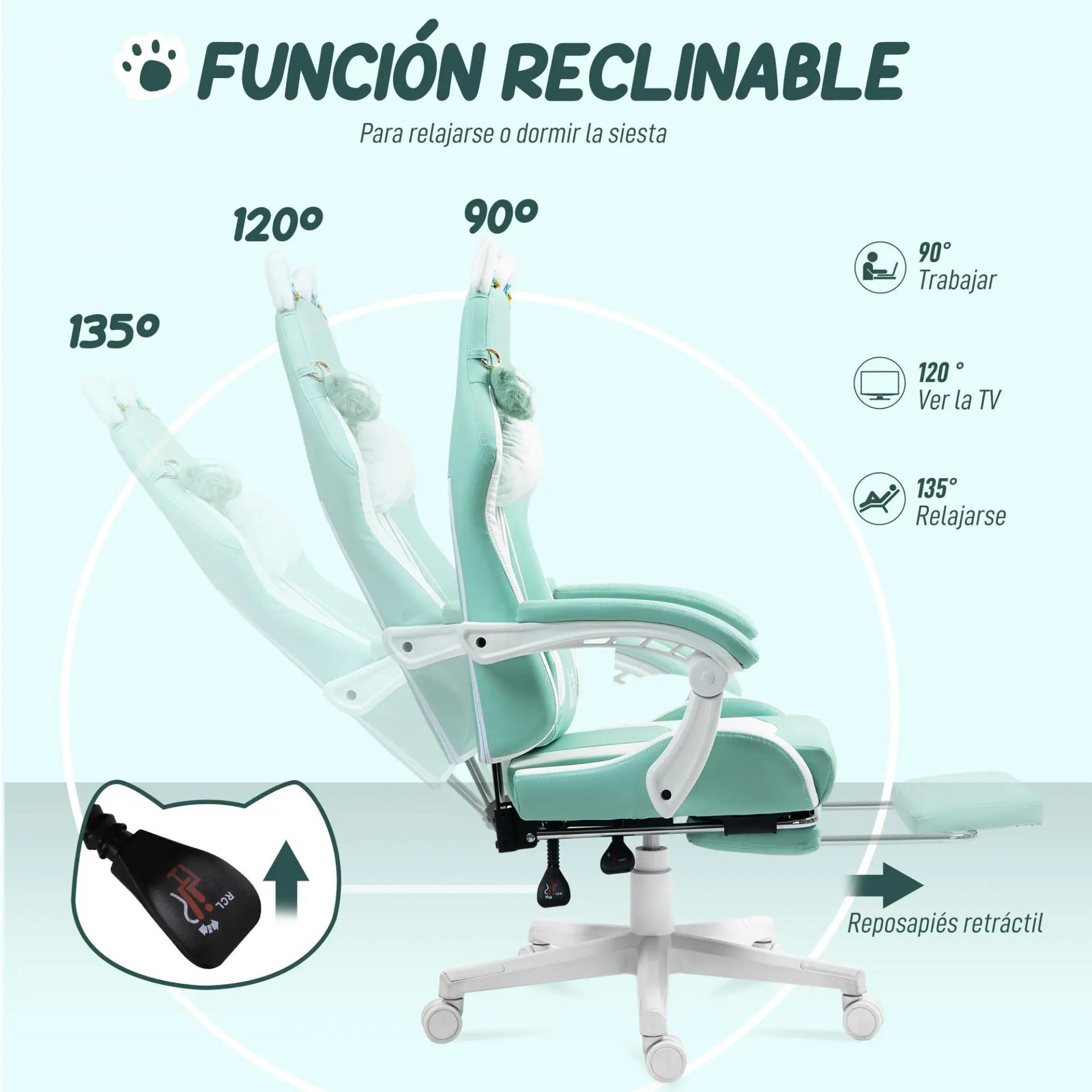 Silla Gamer Reclinable con Altura Ajustable Reposapiés Retráctil Soporte Lumbar y Reposacabezas Desmontable Verde Menta