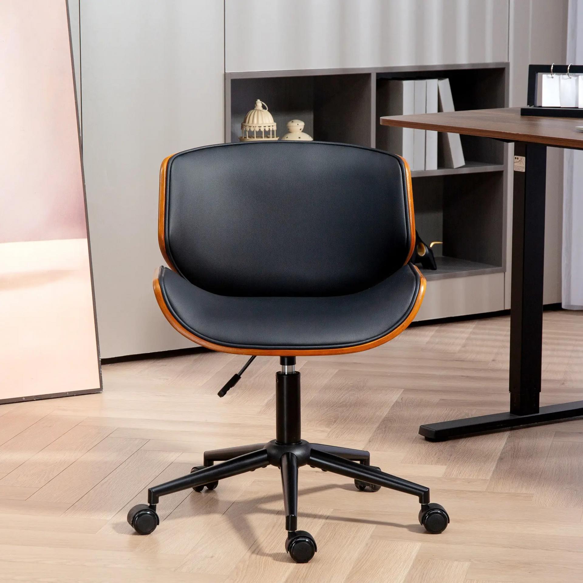INSPIRACIÓN VINTAGE: Con estructura curva en madera con acabado nogal, tapizado en piel sintética negra y diseño sin brazos, esta silla de escritorio encaja a la perfección en espacios con estilo moderno de mediados de siglo, y adecuado para oficinas en casa, dormitorios o salas de estar