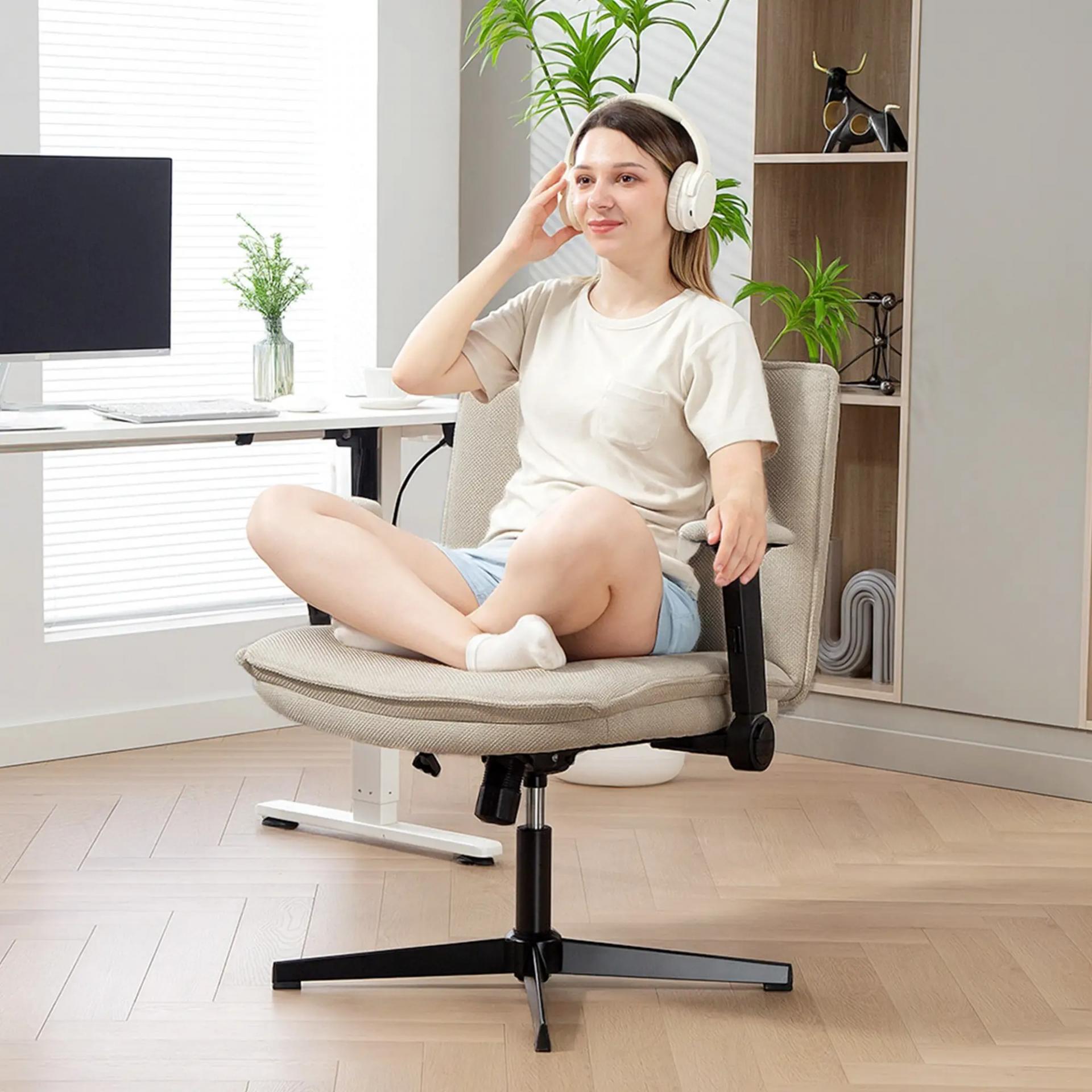 Silla de Oficina Piernas Cruzadas con Reposabrazos Abatible Asiento Ancho sin Ruedas Altura Ajustable Giratoria Crema