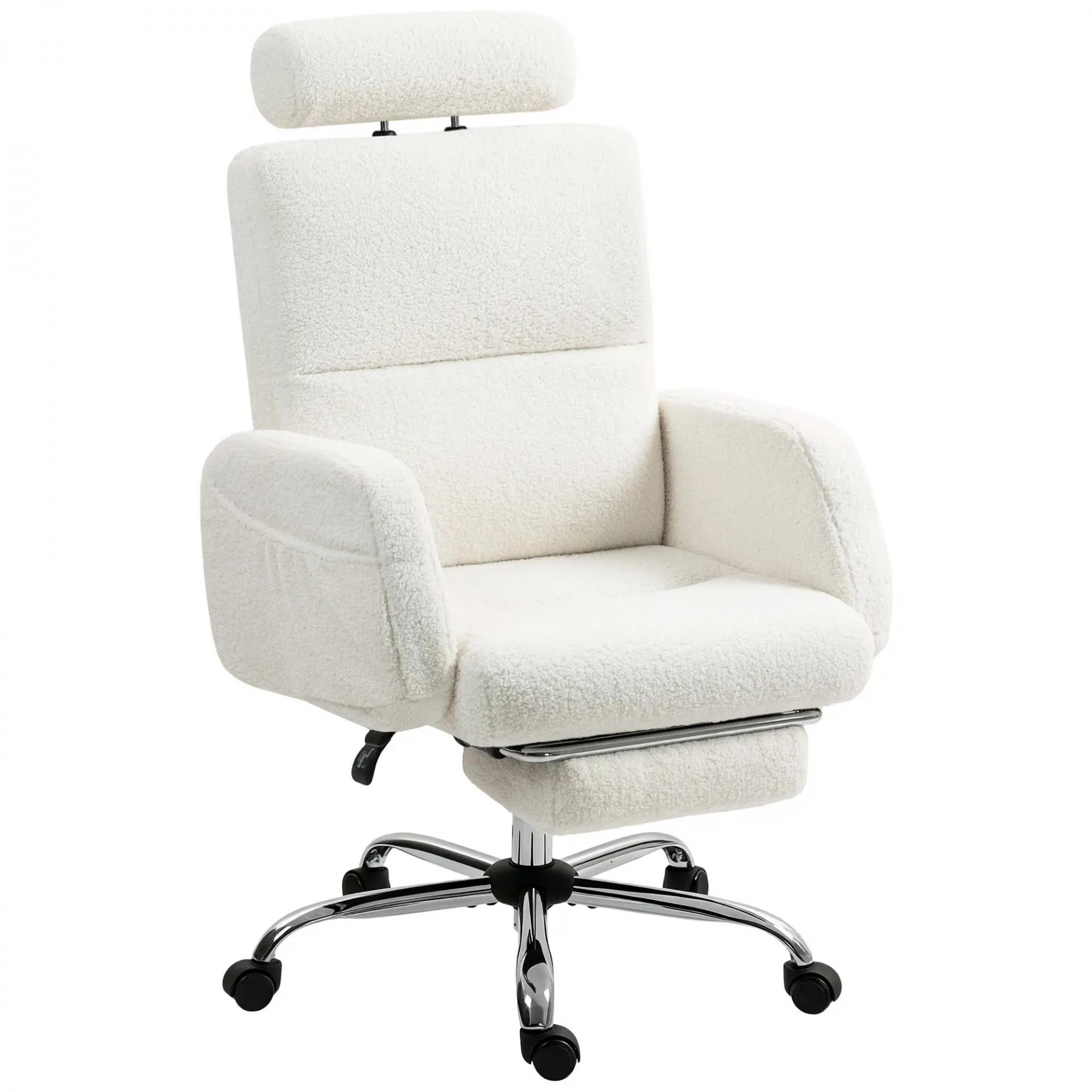 Silla de Escritorio con Reposapiés Tapizada en Borreguito con Respaldo Reclinable Reposacabezas Ajustable Crema