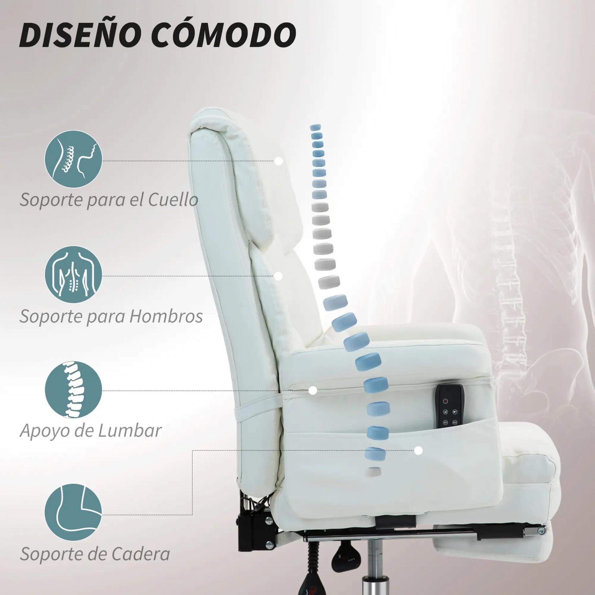Silla de Oficina con 6 Puntos de Masaje Reposapiés Retráctil Altura Ajustable Control Remoto y Soporte Lumbar Blanco