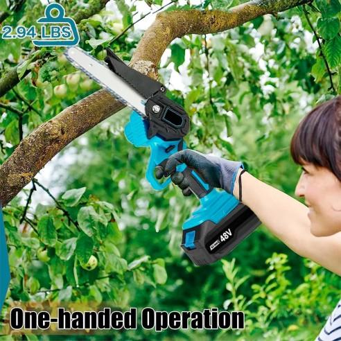 Funciona con una batería de 48 V de gran capacidad, con protección contra sobrecarga y carga rápida. Su motor de cobre ofrece una salida fuerte y estable, mientras que la cadena de acero al carbono, afilada y resistente al desgaste, garantiza cortes suaves y precisos.