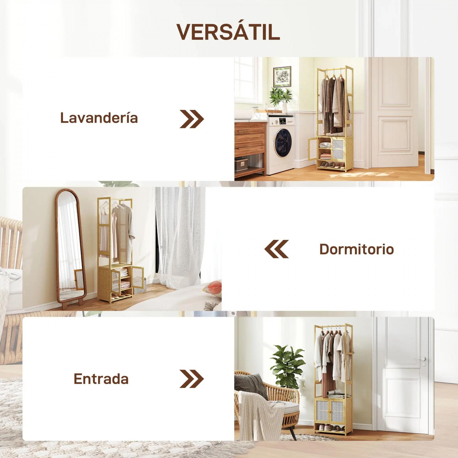 - PERCHERO ESTRECHO Y ELEGANTE: Con un diseño compacto y acabado en madera natural, este perchero con armario se adapta a espacios reducidos y aporta un toque decorativo gracias a sus puertas de tejido trenzado