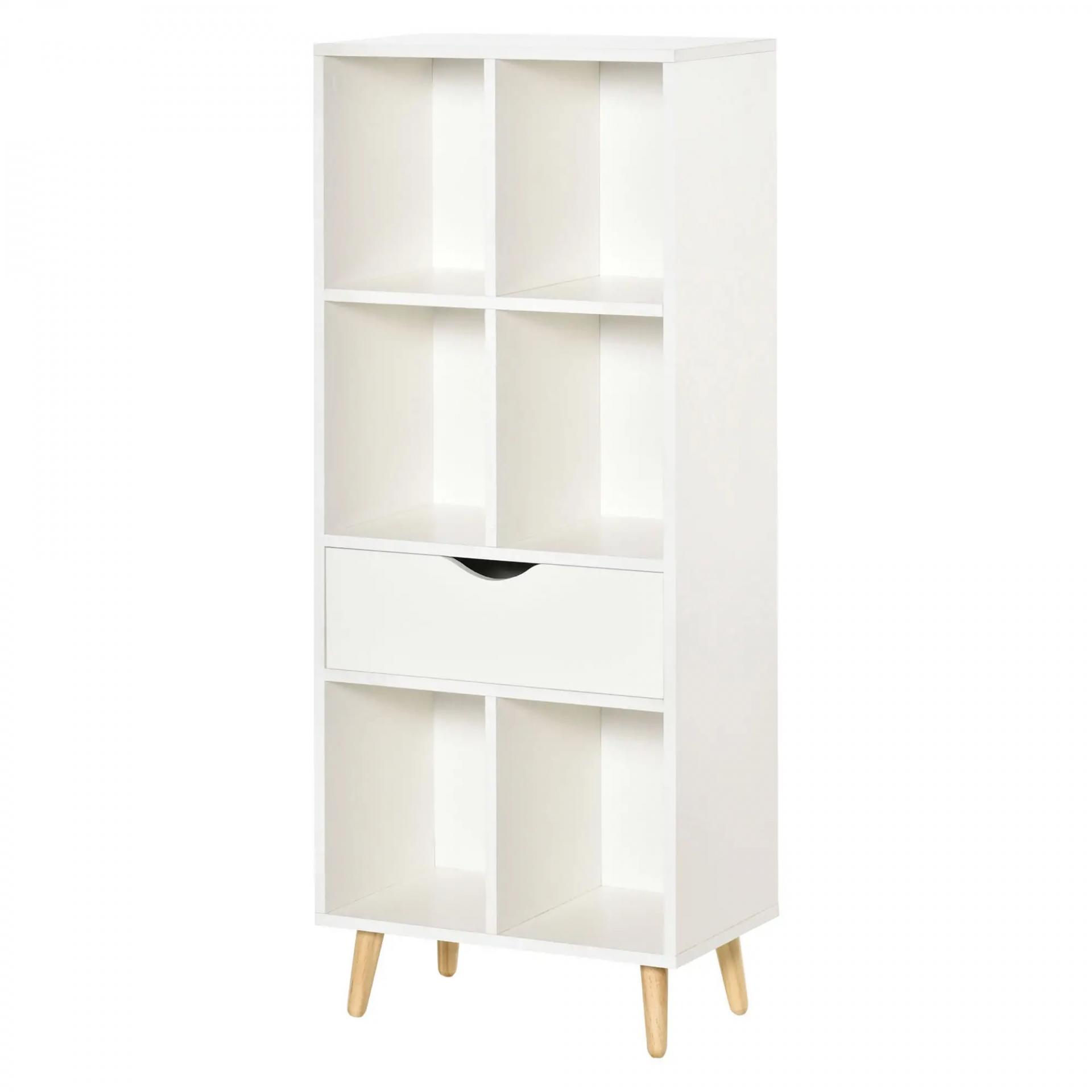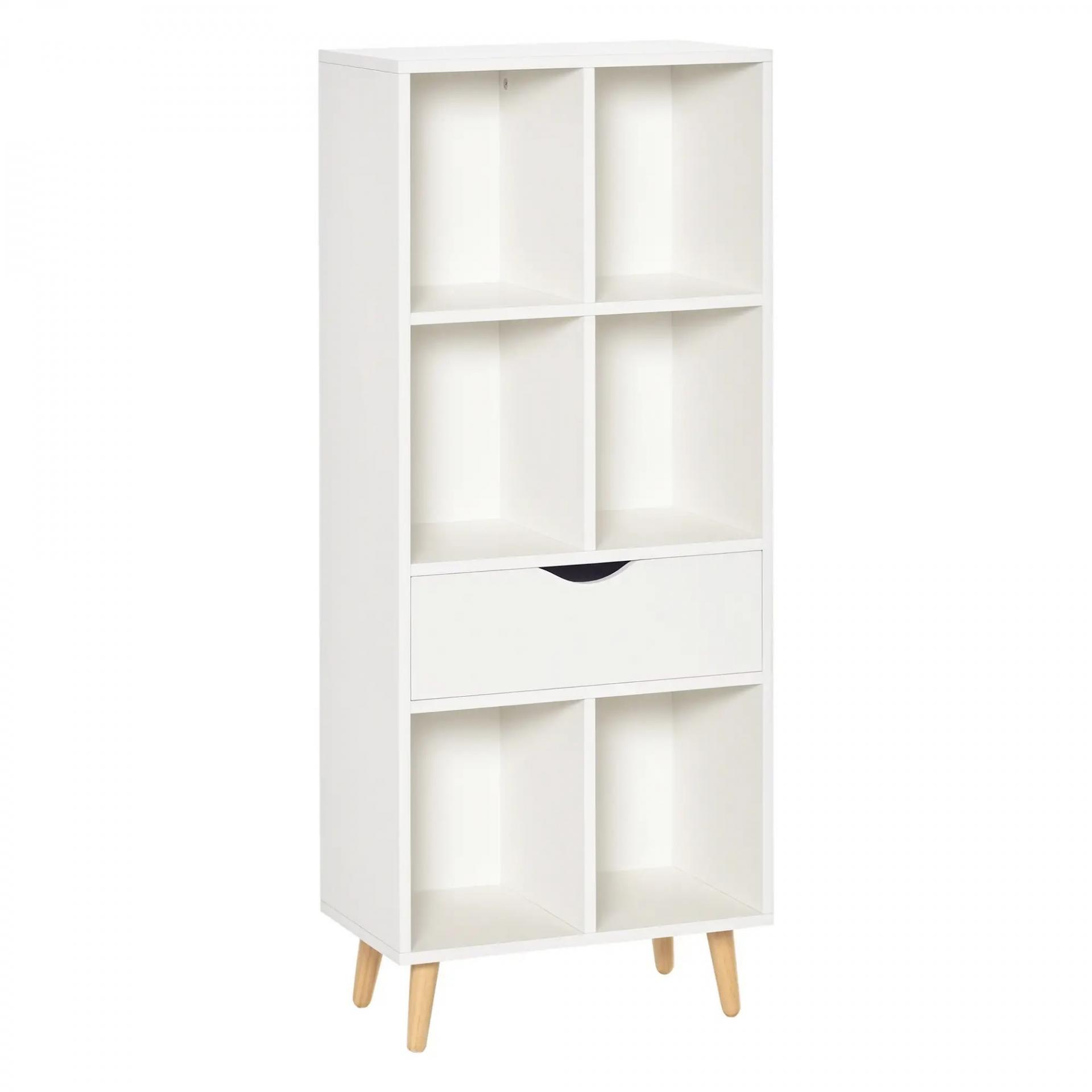 Estantería para Libros con 1 Cajón y Patas de Madera 6 Compartimentos Abiertos de Almacenaje 50x29,5x120 cm Blanco