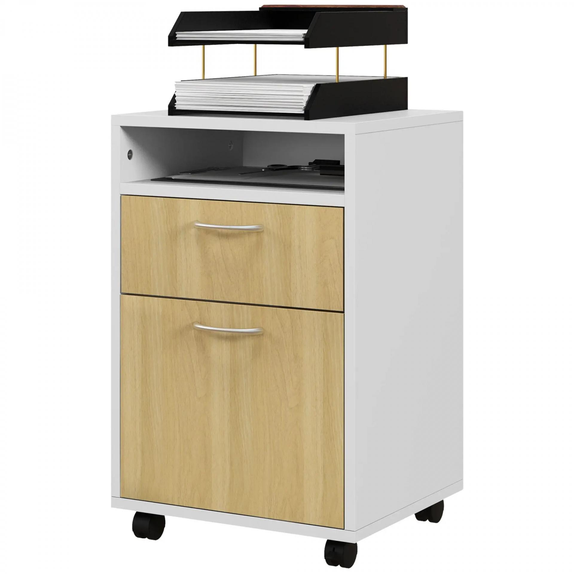 Cajonera de Oficina Móvil con Cajón y Armario con Ruedas Soporte de Impresora para Estudio 40x35x60 cm Blanco y Natural