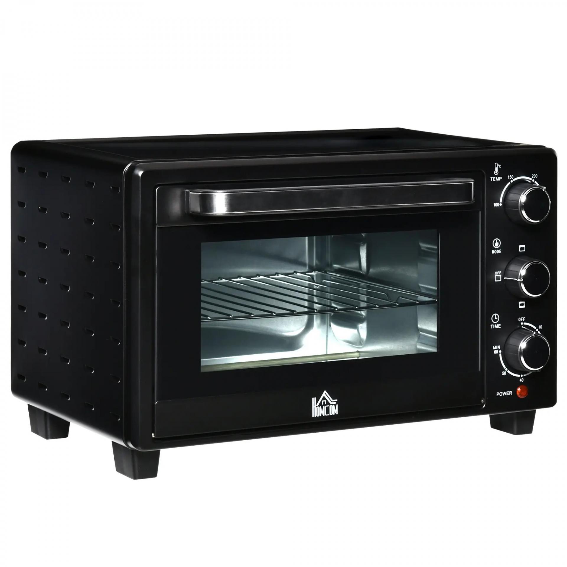 TEMPERATURA REGULABLE Y TEMPORIZADOR: Ajusta fácilmente la temperatura de este mini horno eléctrico HOMCOM de color negro de 100°C a 230°C y configura el temporizador hasta 60 minutos para adaptarlo a tus recetas