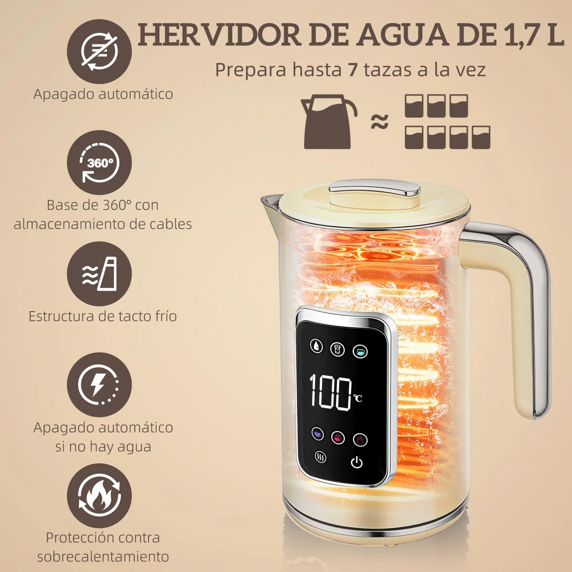 - 6 PROGRAMAS Y FUNCIÓN MANTENER CALIENTE: El hervidor de agua permite seleccionar entre 6 temperaturas ideales para té, café o leche. Incluye memoria térmica para mantener el agua caliente hasta 3 horas, con apagado automático para mayor comodidad y seguri