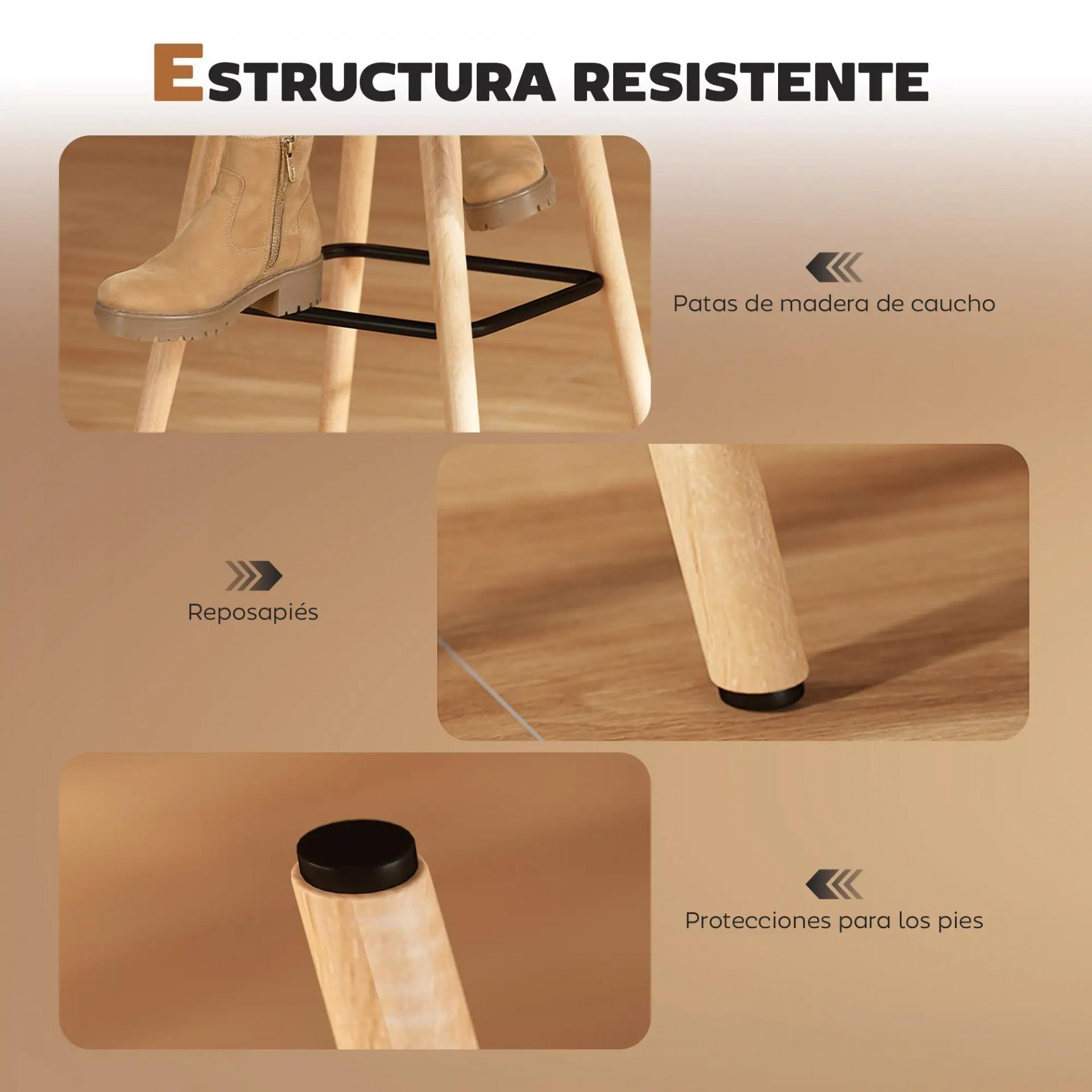 - ESTRUCTURA RESISTENTE: Cada taburete alto está fabricado con patas de madera maciza ligeramente inclinadas y con reposapiés integrado en acero, garantizando gran estabilidad y soporte seguro en todo momento