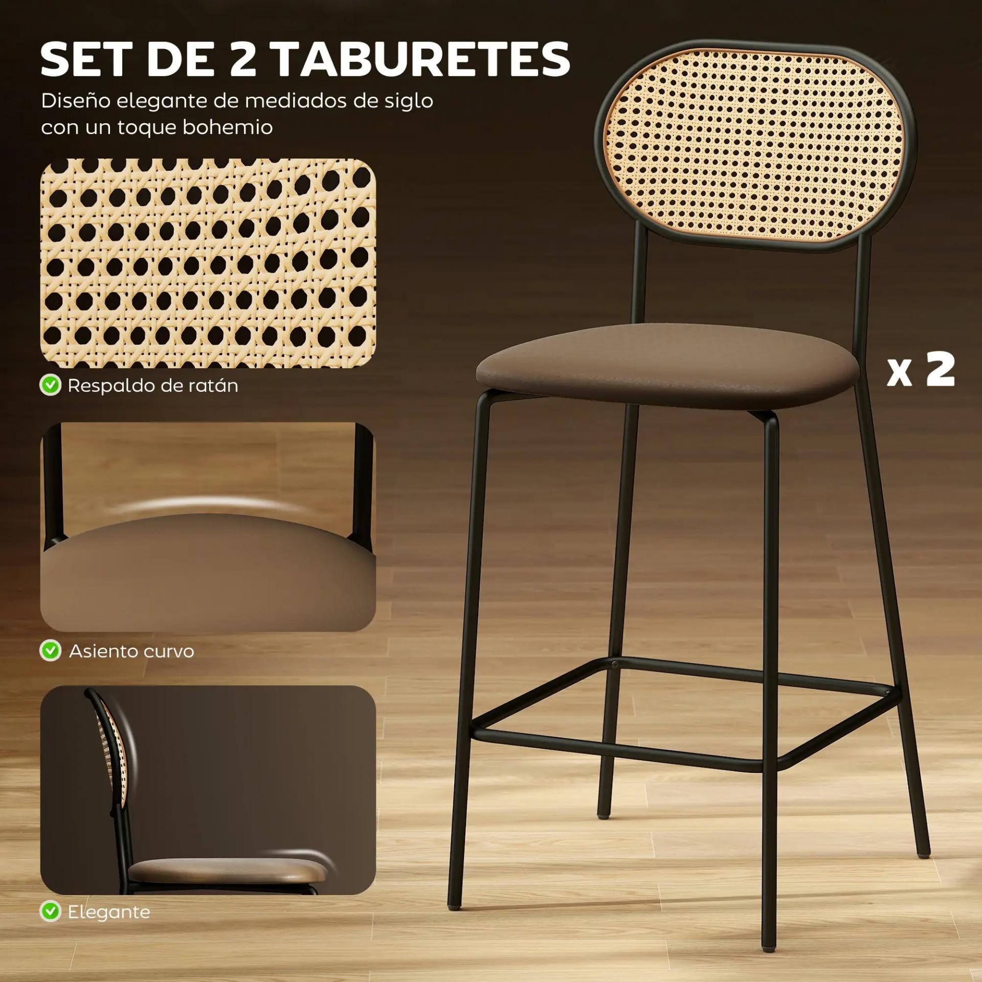 ESTILO BOHO: Este set de 2 taburetes altos con respaldo de ratán sintético en tono natural, asiento marrón y estructura negra dará un toque único y acogedor a tu comedor, cocina o donde decidas colocarlos