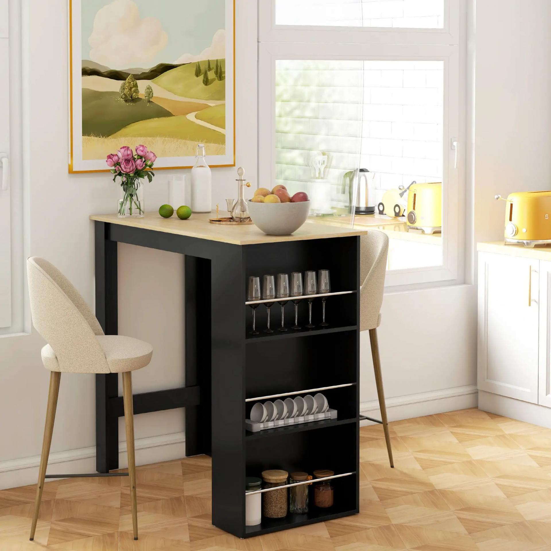 - ESPACIO DE ALMACENAJE: Esta mesa alta de cocina incluye una estantería con 3 estantes, ideal para guardar cristalería, vasos, botellas o alimentos. Mantén todo ordenado y siempre a mano mientras disfrutas de tus comidas o reuniones en casa