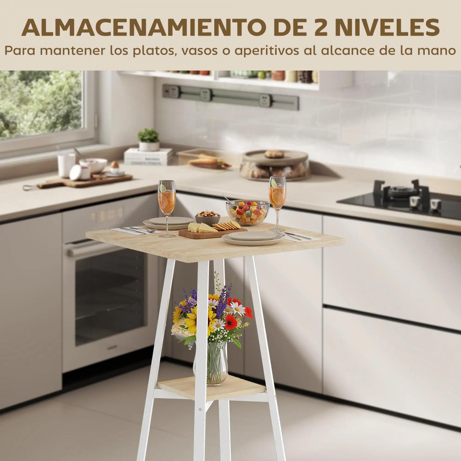 Mesa Alta Cocina Cuadrada con Estante para 2 Personas Patas de Metal 55x55x95 cm Madera Natural y Blanco