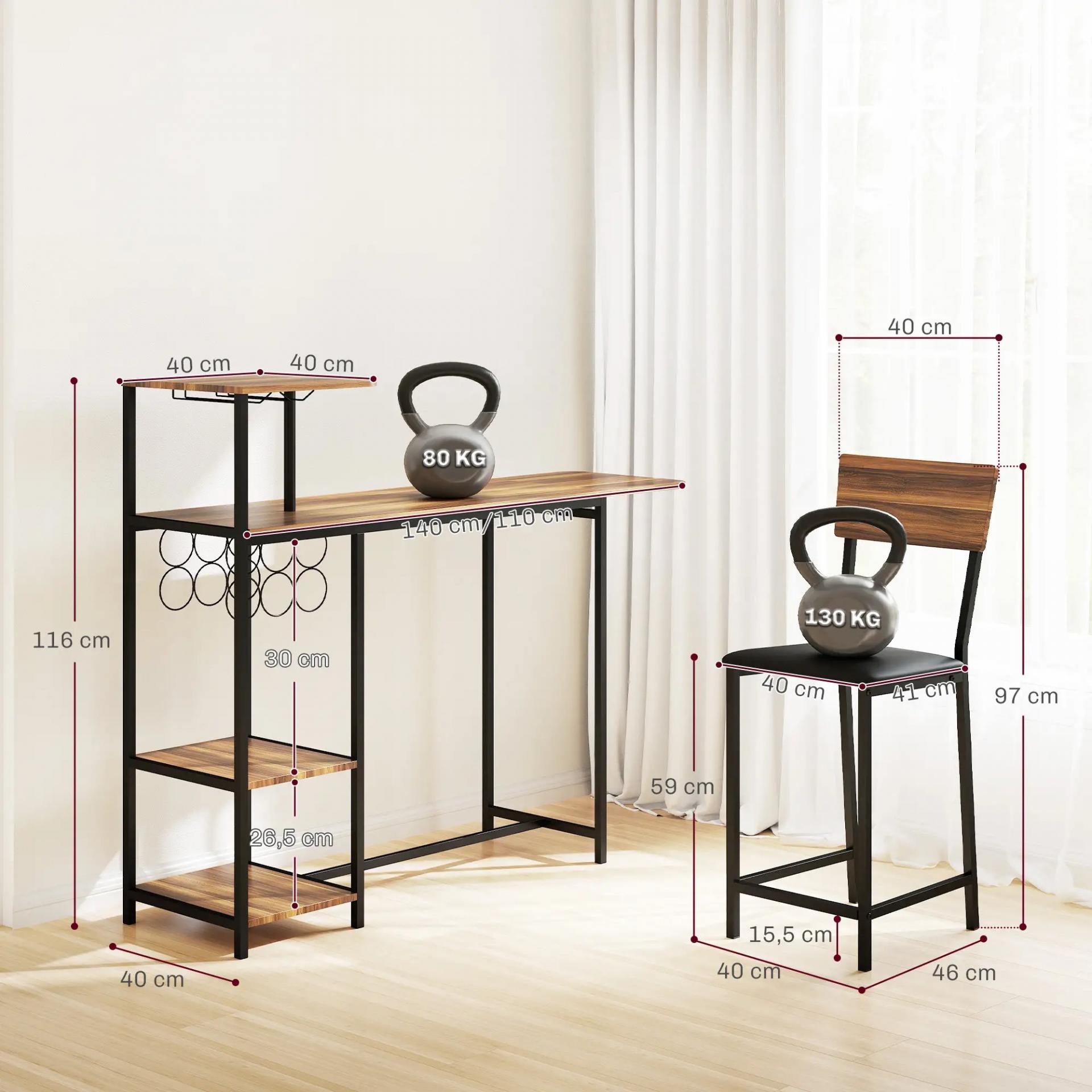 Conjunto de Mesa de Bar con Laterales Abatibles Soporte para Vinos y 2 Taburetes de Estilo Industrial Marrón y Negro