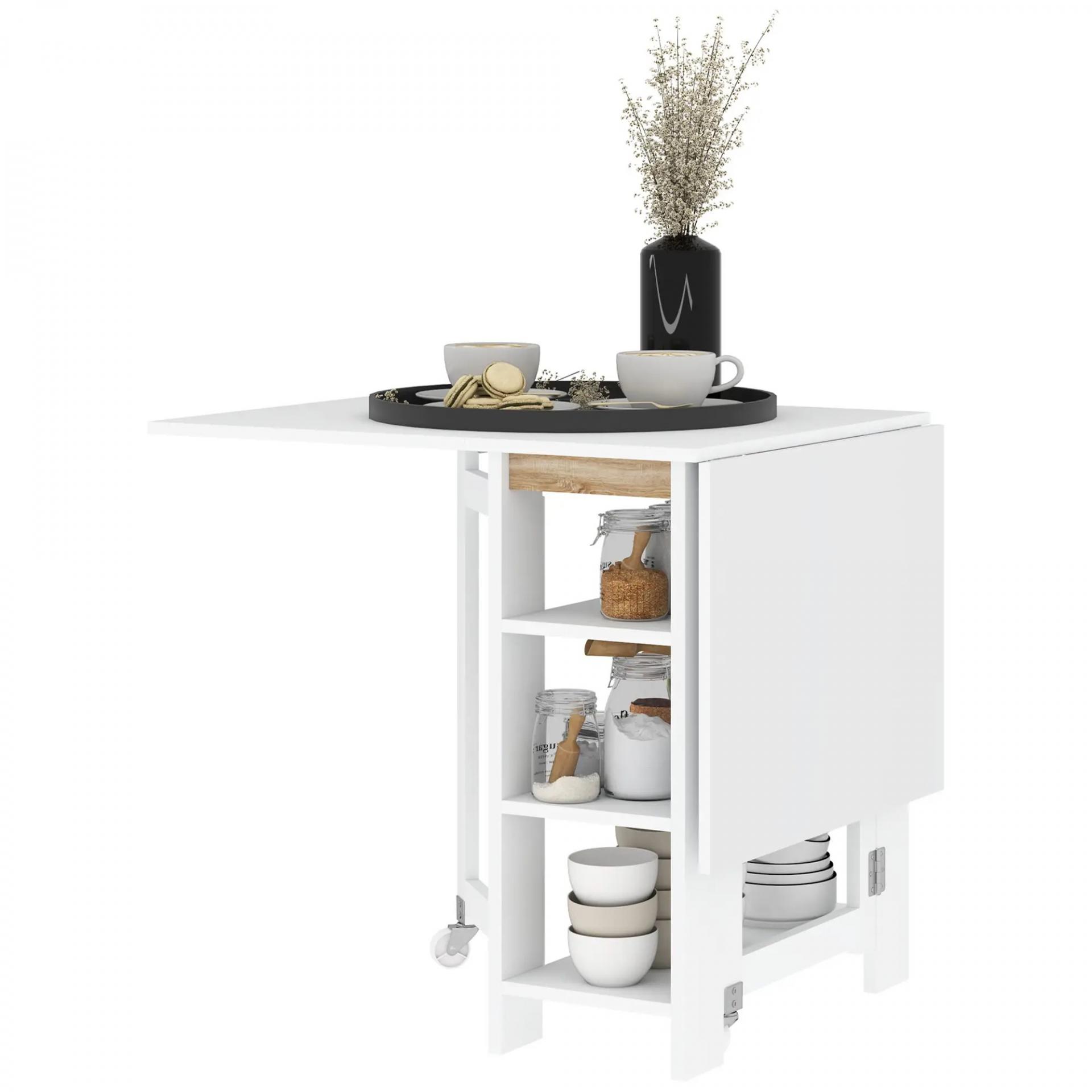 Mesa de Cocina Plegable con Alas Abatibles 2 Ruedas y Estantes Estilo Moderno 120x60x75 cm Blanco
