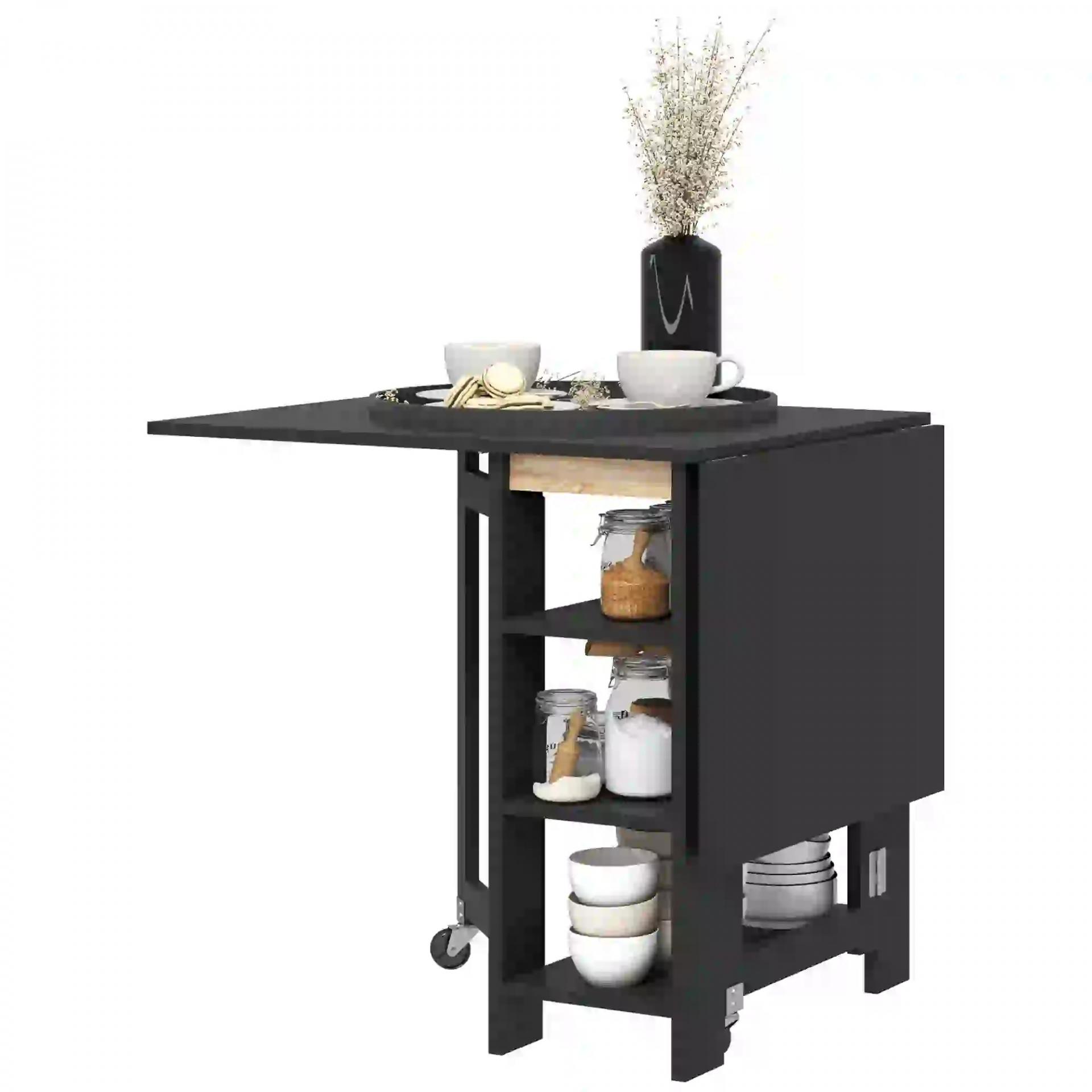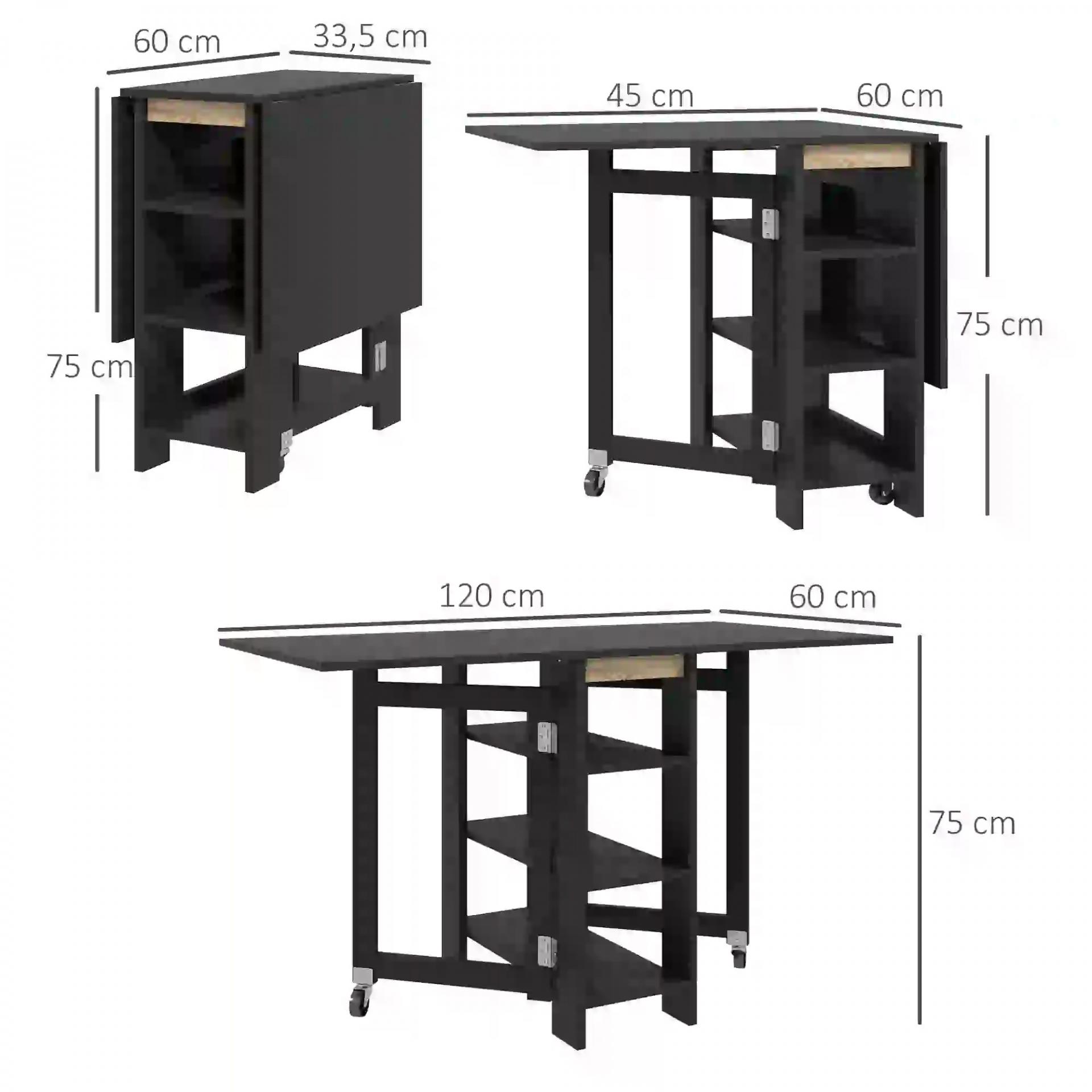 Mesa de Cocina Plegable con Alas Abatibles 2 Ruedas y Estantes Estilo Moderno 120x60x75 cm Negro